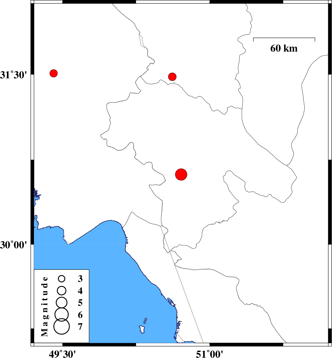 | 2019/08/04 | 19:51:17.2 | 00:21:17.2 | 30.62 | 50.71 | 9 | ML:5.4 | Kohkiluieh va boyerahmad Province, 23 km South-East of Dehdasht | ||