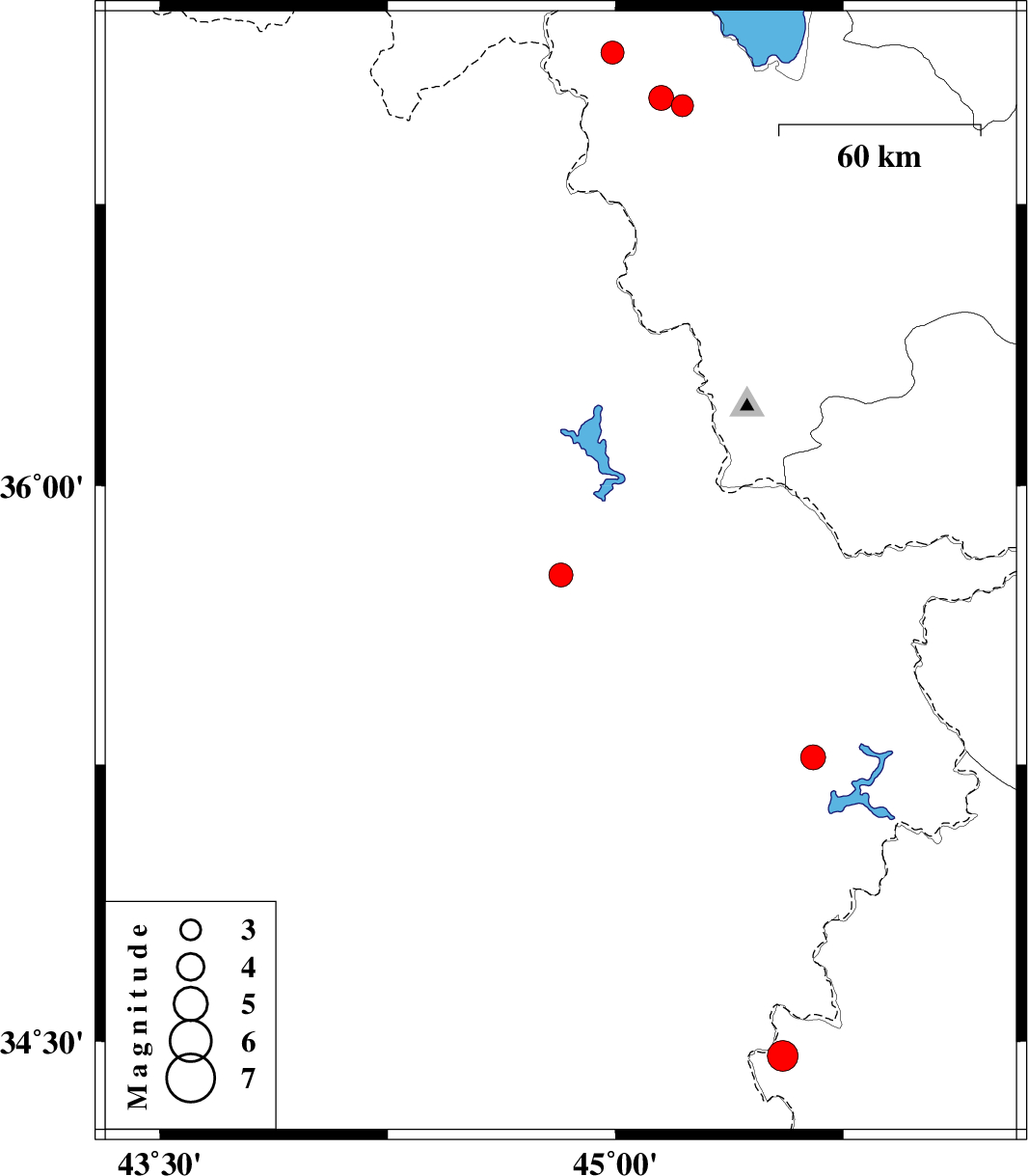 | 2019/08/12 | 04:52:13.8 | 09:22:13.8 | 35.27 | 45.65 | 9 | ML:3.7 | Iraq, 38 km South-East of Sulaymaniyah | ||