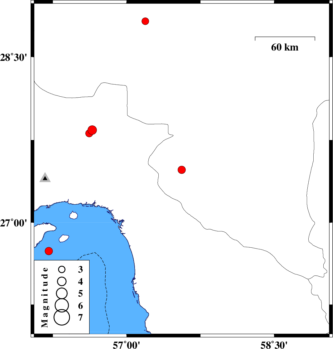 | 2019/08/28 | 16:36:15.5 | 21:06:15.5 | 27.48 | 57.56 | 14 | ML:3.5 | Kerman Province, 10 km of Manujan | ||