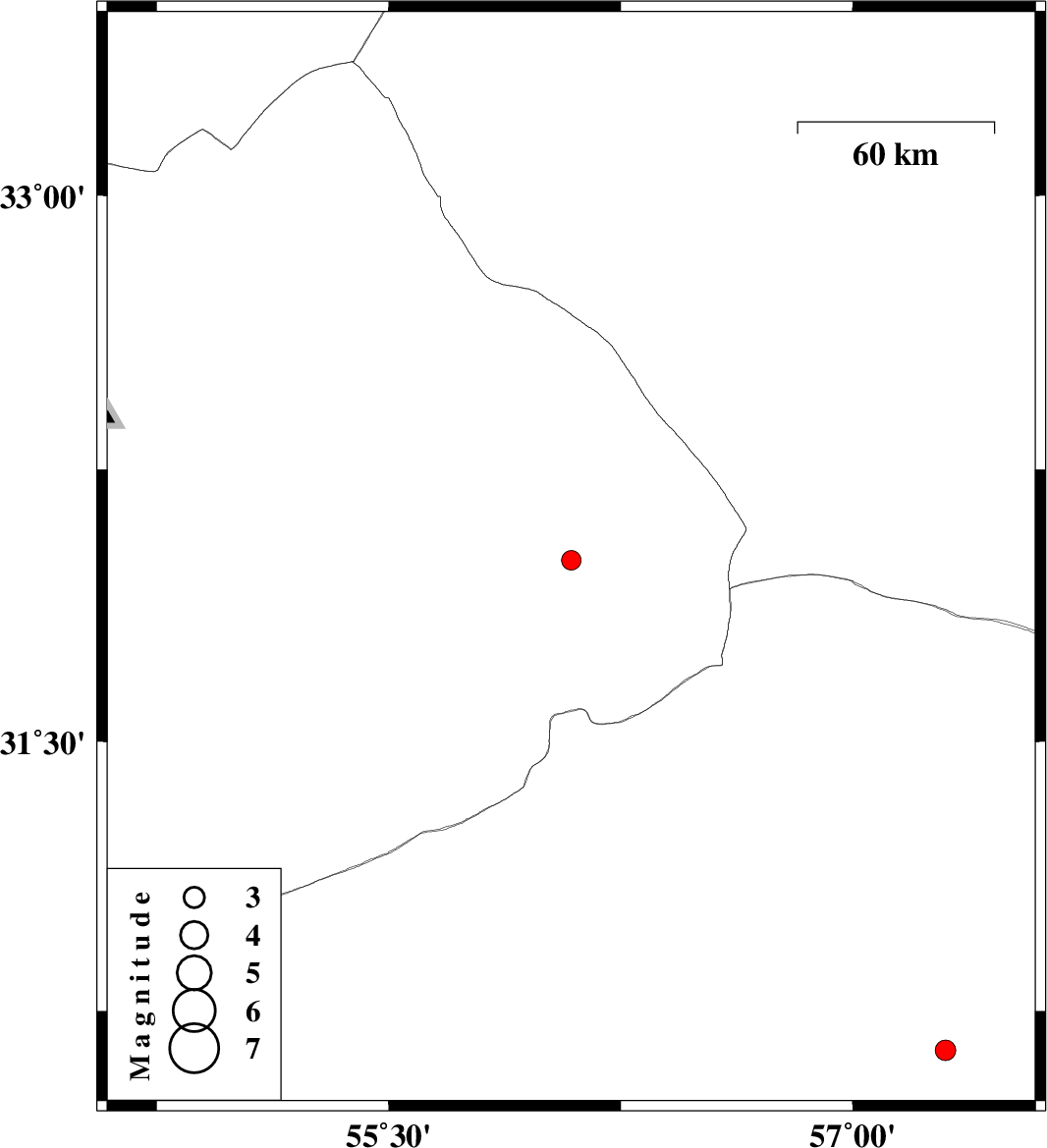 | 2019/08/29 | 17:02:55.1 | 21:32:55.1 | 30.64 | 57.3 | 15 | ML:3 | Kerman Province, 45 km North-East of Kerman |