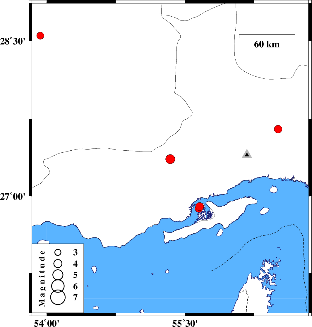 | 2019/09/08 | 19:13:46.5 | 23:43:46.5 | 26.9 | 55.66 | 14 | ML:4 | Persian Gulf, 60 km -West of Qeshm | ||