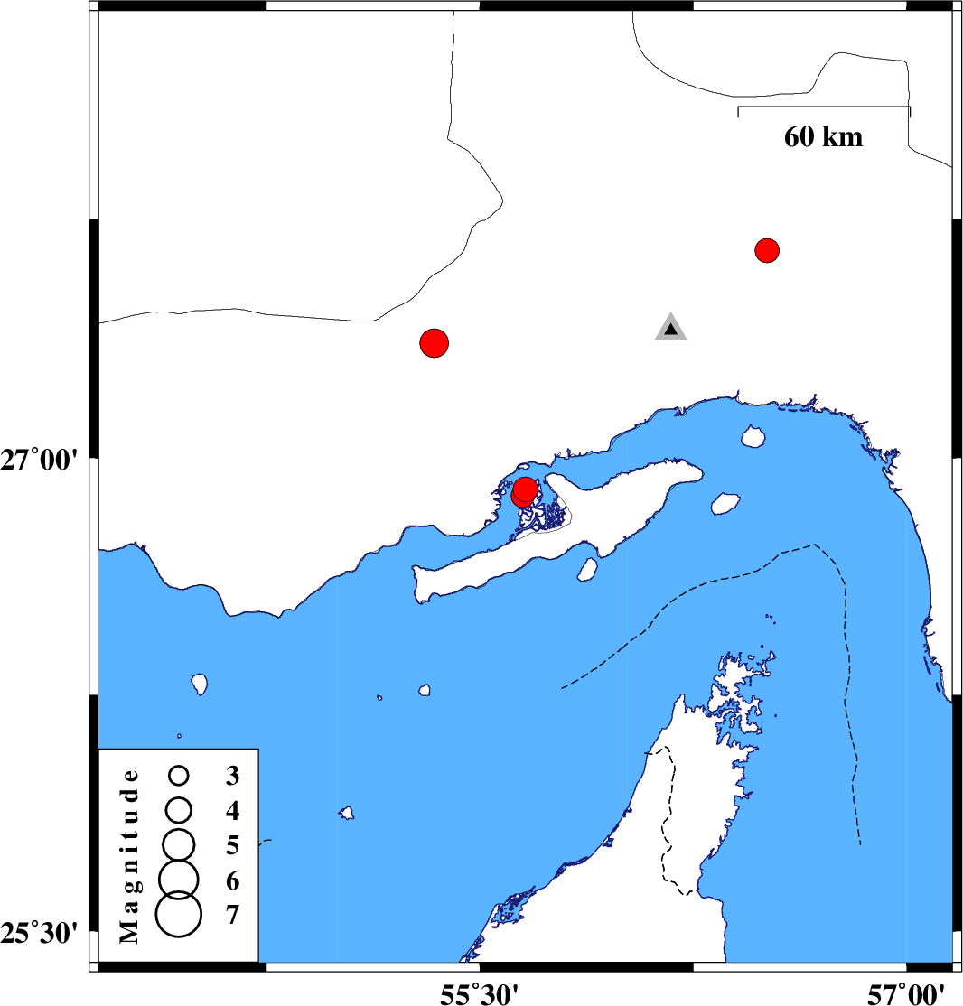 | 2019/09/08 | 19:13:46.5 | 23:43:46.5 | 26.9 | 55.66 | 14 | ML:4 | Persian Gulf, 60 km -West of Qeshm | ||