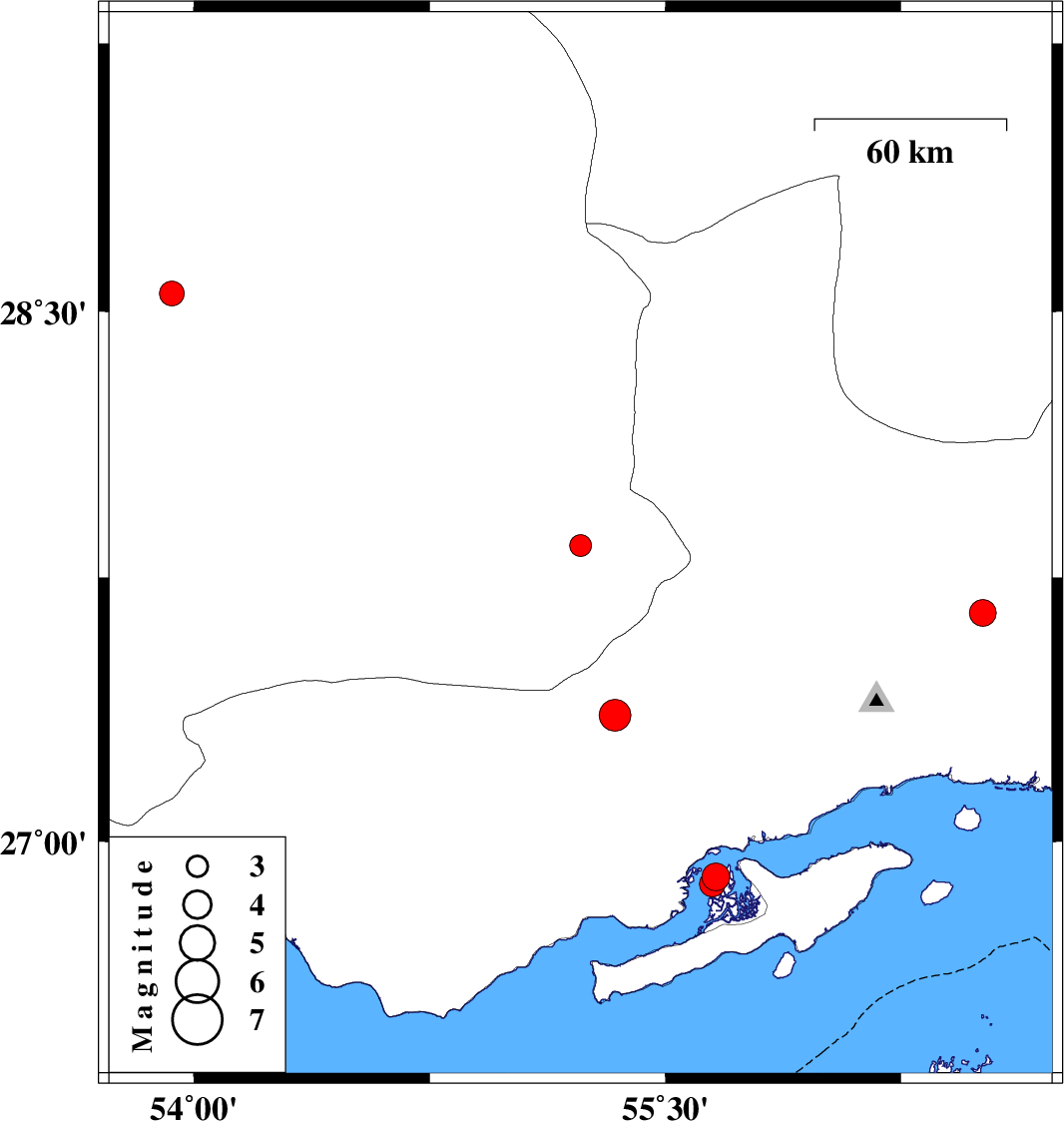 | 2019/09/08 | 19:13:46.5 | 23:43:46.5 | 26.9 | 55.66 | 14 | ML:4 | Persian Gulf, 60 km -West of Qeshm | ||