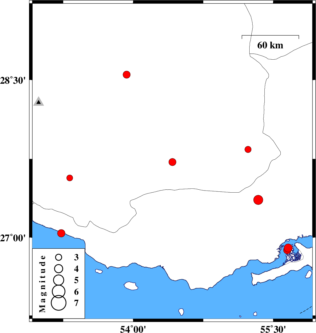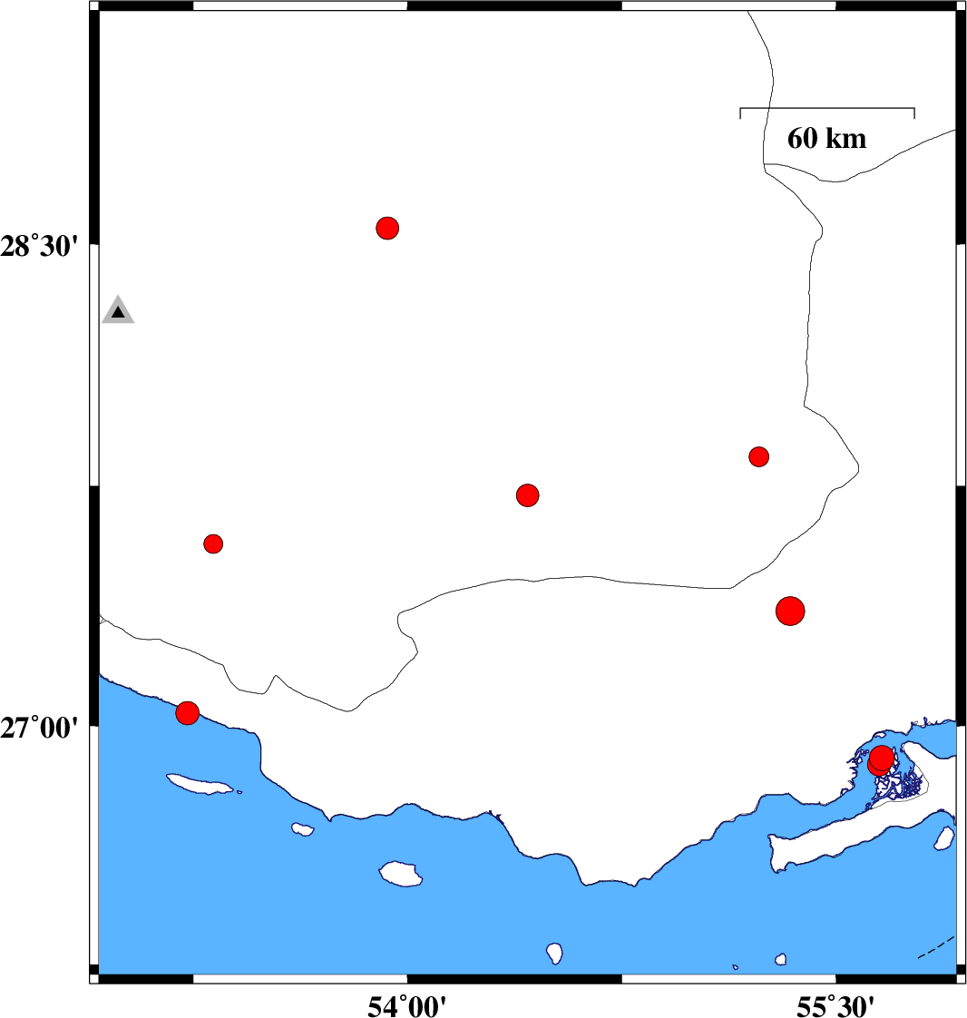 | 2019/09/08 | 19:13:46.5 | 23:43:46.5 | 26.9 | 55.66 | 14 | ML:4 | Persian Gulf, 60 km -West of Qeshm | ||