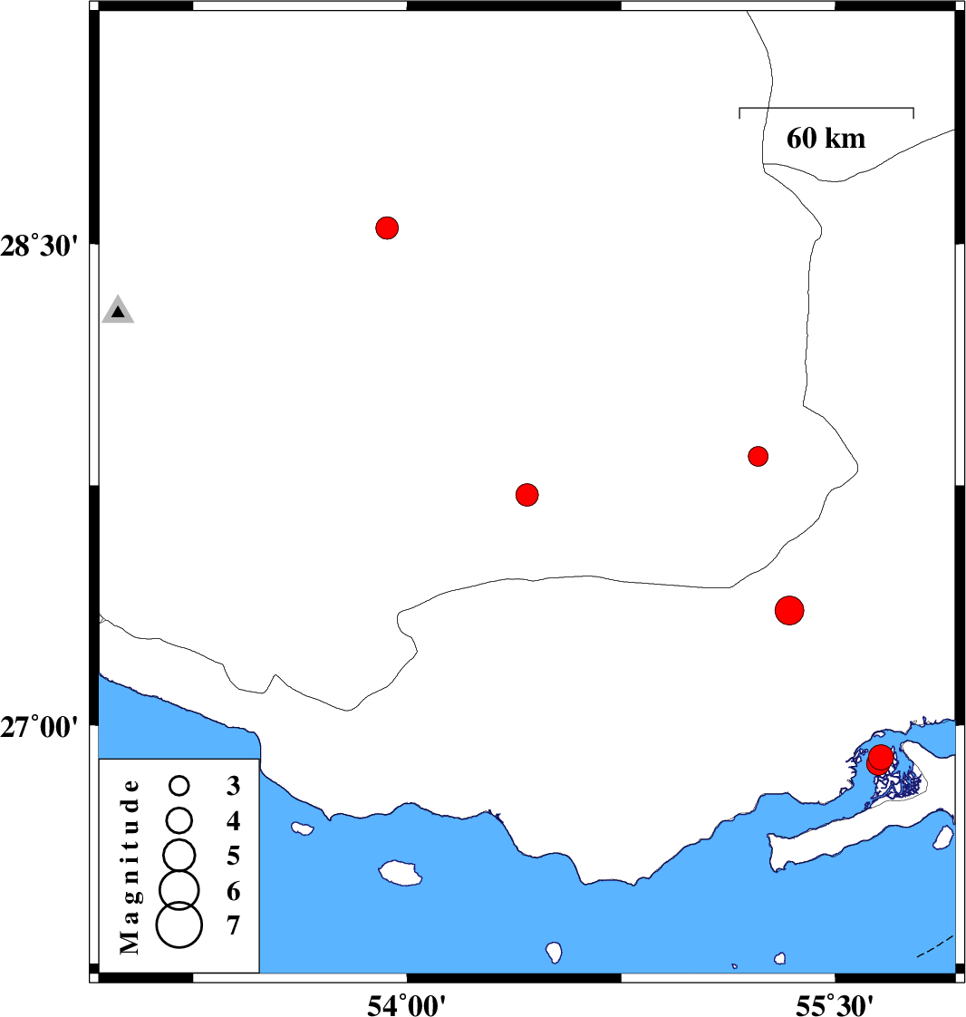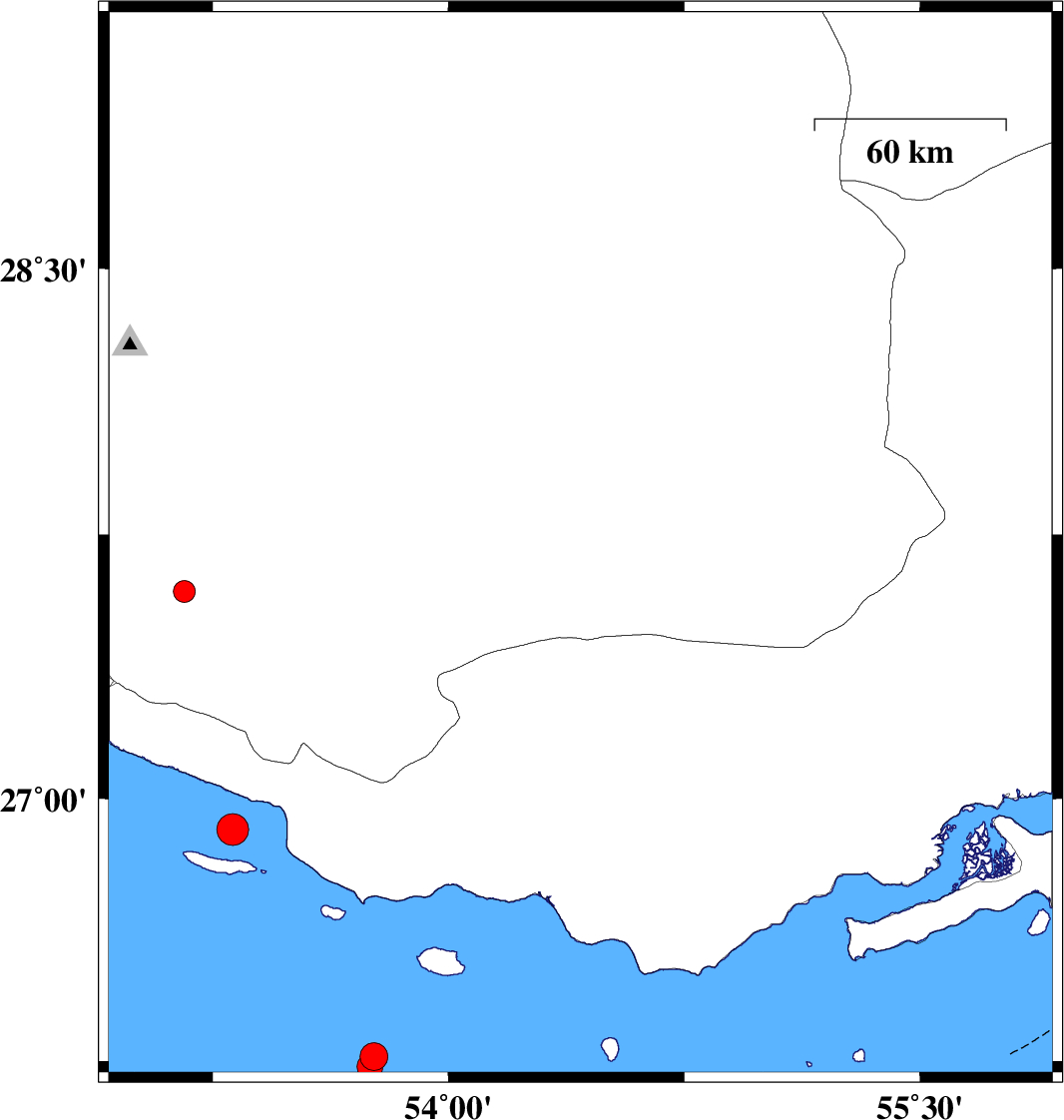 | 2019/09/08 | 19:13:46.5 | 23:43:46.5 | 26.9 | 55.66 | 14 | ML:4 | Persian Gulf, 60 km -West of Qeshm | ||