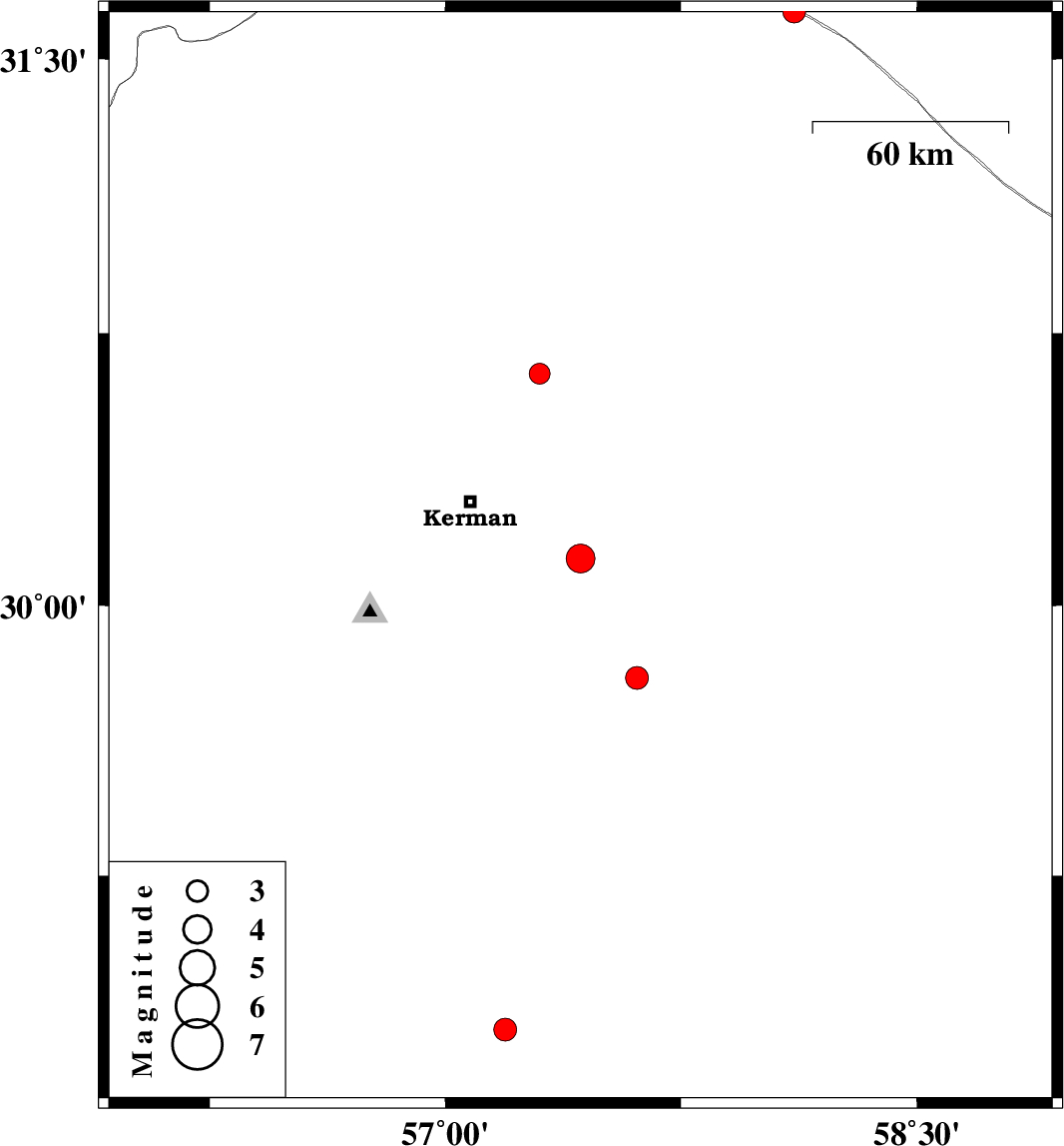 | 2019/08/29 | 17:02:55.1 | 21:32:55.1 | 30.64 | 57.3 | 15 | ML:3 | Kerman Province, 45 km North-East of Kerman | ||