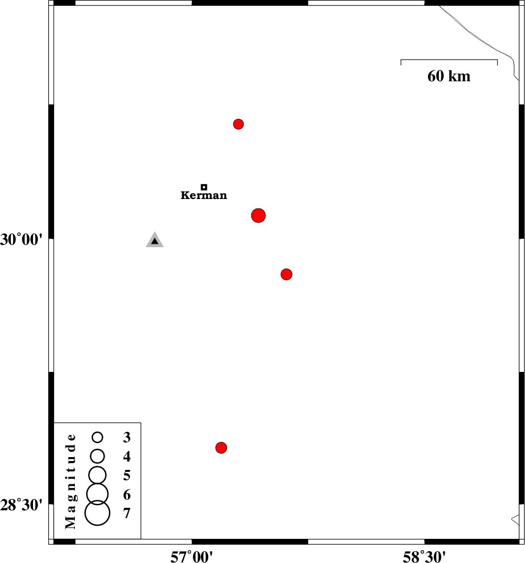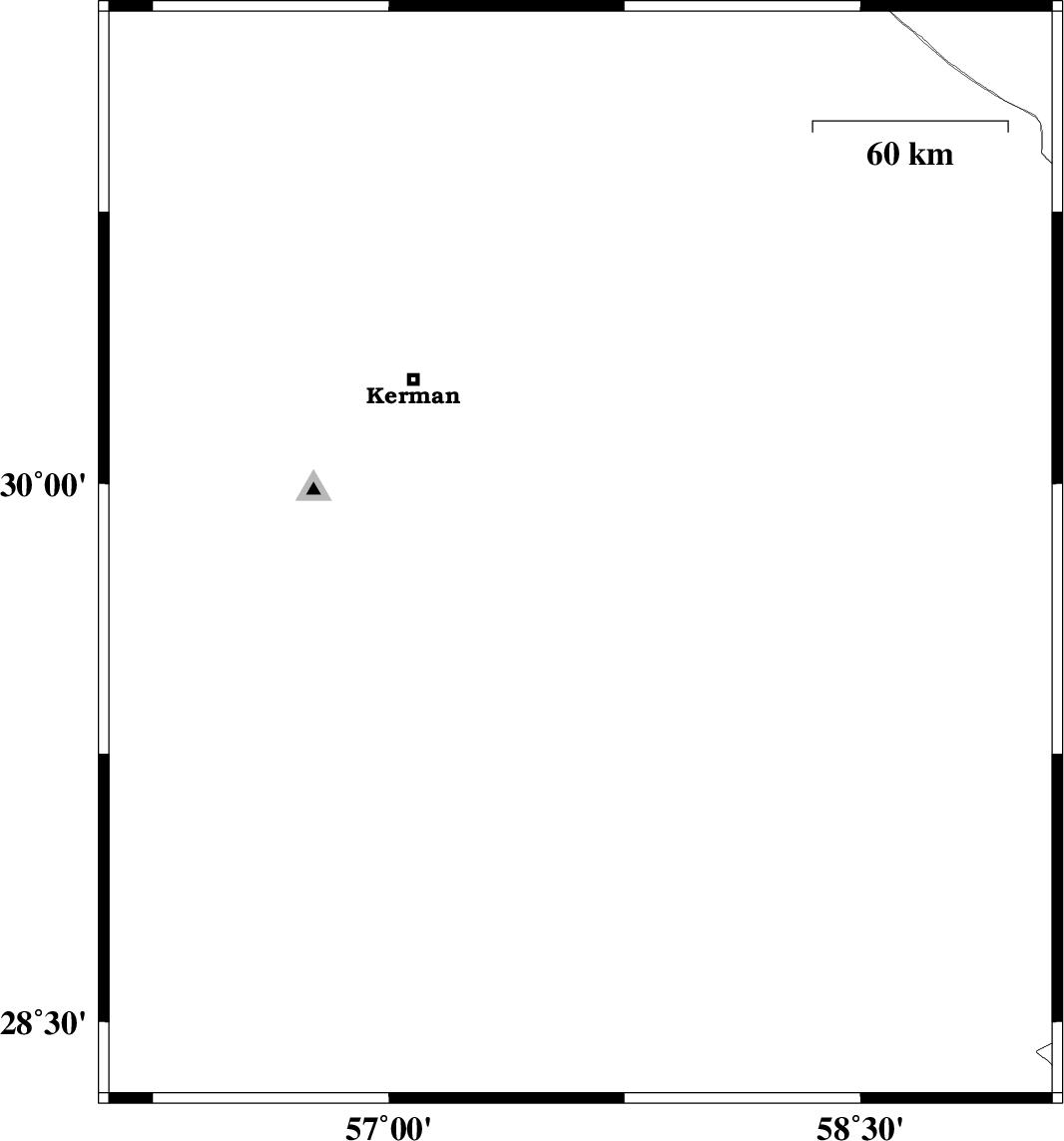 | 2019/08/29 | 17:02:55.1 | 21:32:55.1 | 30.64 | 57.3 | 15 | ML:3 | Kerman Province, 45 km North-East of Kerman | ||