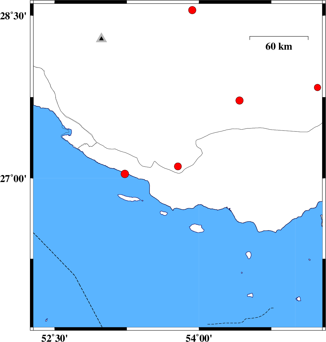 | 2019/08/29 | 22:17:22.5 | 02:47:22.5 | 27.04 | 53.23 | 15 | ML:3.6 | Persian Gulf, 33 km South of Lamerd |