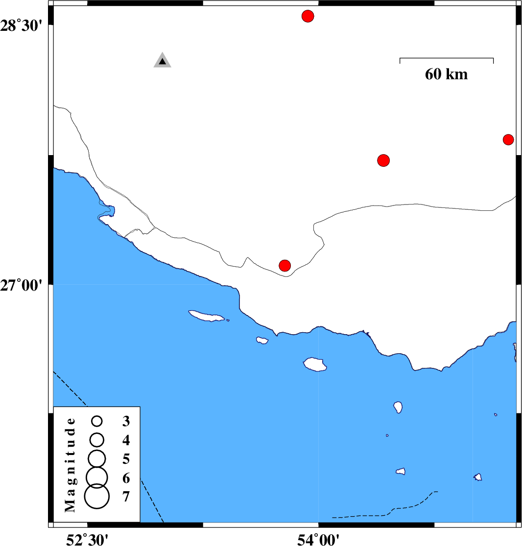 | 2019/09/06 | 14:22:50.9 | 18:52:50.9 | 28.55 | 53.93 | 11 | ML:3.5 | Fars Province, 37 km -East of Jahrom |