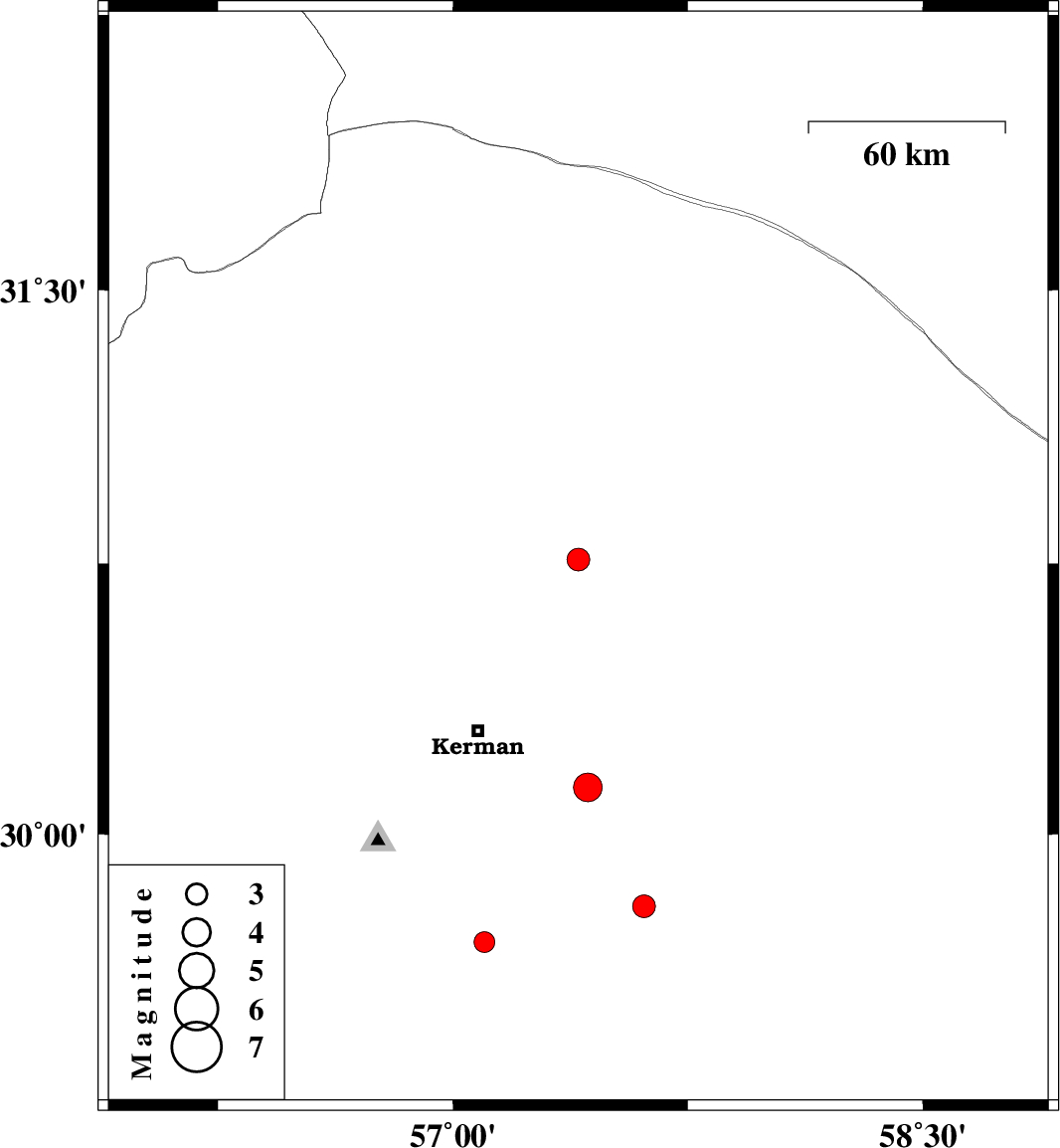 | 2019/09/13 | 21:05:43.2 | 01:35:43.2 | 29.7 | 57.1 | 11 | ML:3 | Kerman Province, 65 km South of Kerman | ||
