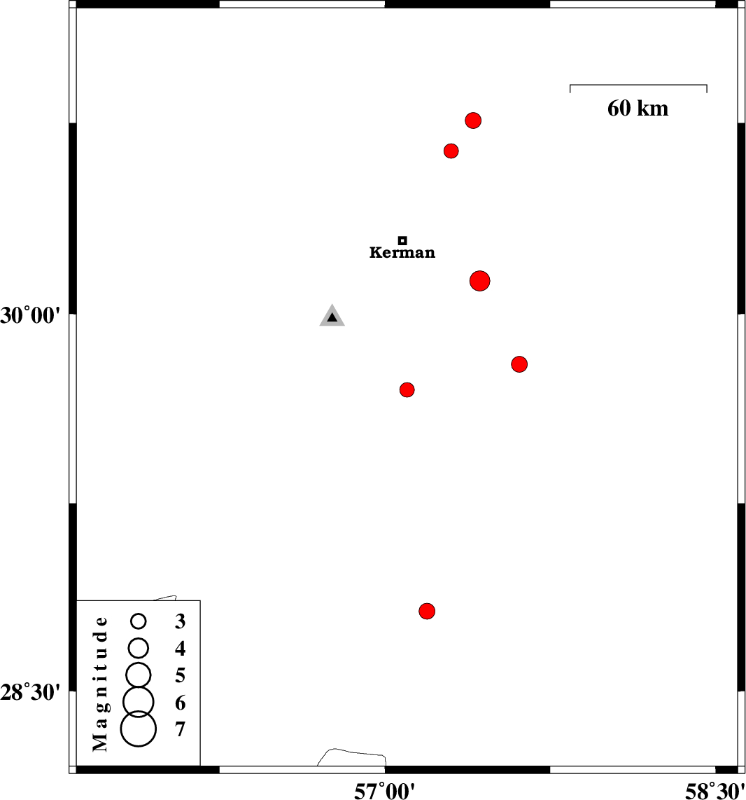 | 2019/08/26 | 20:24:12.8 | 00:54:12.8 | 28.82 | 57.19 | 14 | ML:3.2 | Kerman Province, 56 km North-West of Jiroft |
