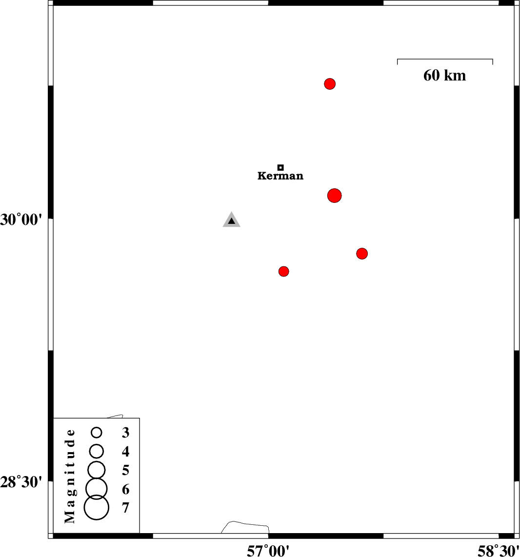 | 2019/09/13 | 03:33:00.7 | 08:03:00.7 | 30.76 | 57.4 | 14 | ML:3.2 | Kerman Province, 61 km North-East of Kerman | ||