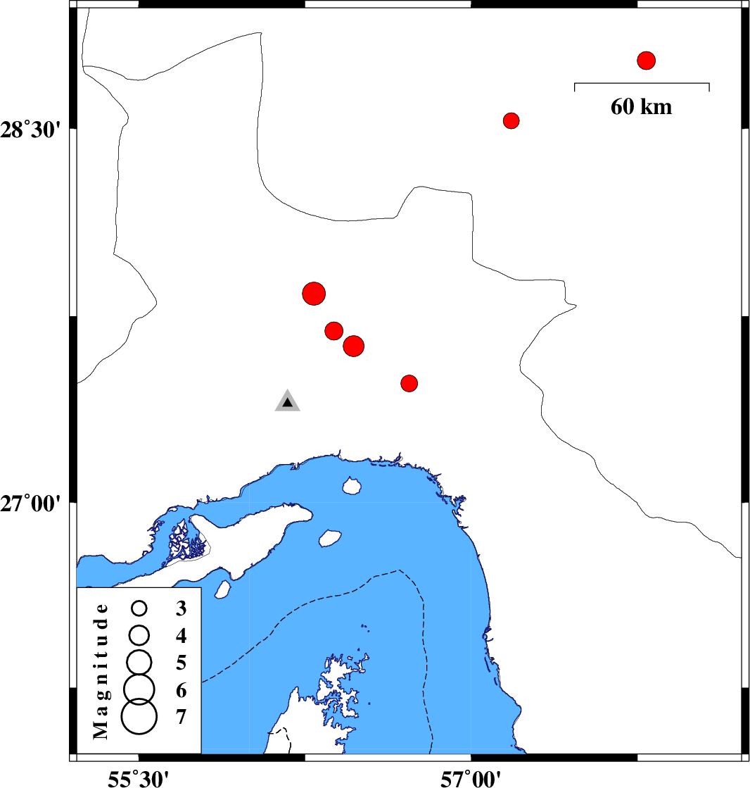 | 2019/09/16 | 20:03:24.2 | 00:33:24.2 | 27.63 | 56.47 | 12 | ML:4.3 | Hormozgan Province, 53 km North-East of Bandar-e abbas | ||