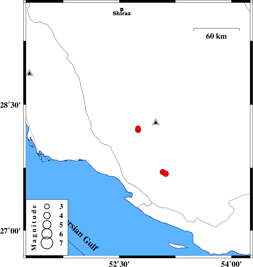 | 2019/09/26 | 12:36:14.3 | 16:06:14.3 | 28.2 | 52.75 | 11 | ML:3.4 | Fars Province, 40 km South-West of Qir va Karzin | ||