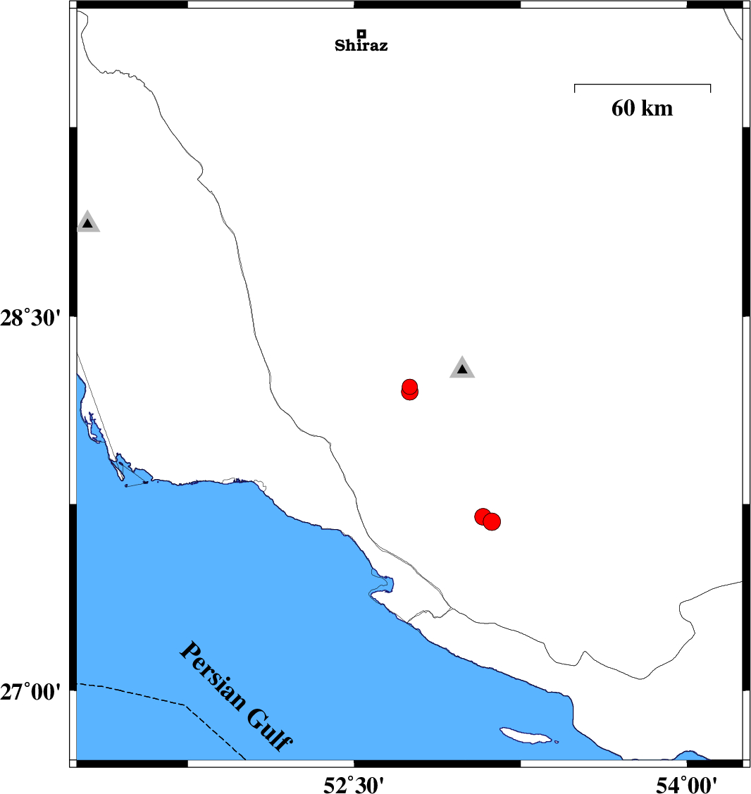 | 2019/09/26 | 12:36:14.3 | 16:06:14.3 | 28.2 | 52.75 | 11 | ML:3.4 | Fars Province, 40 km South-West of Qir va Karzin | ||