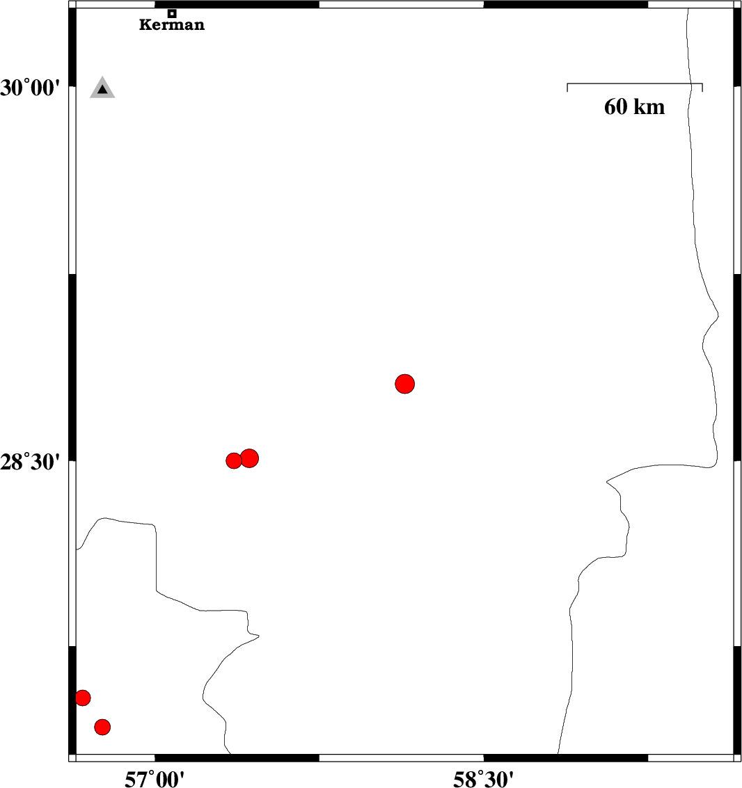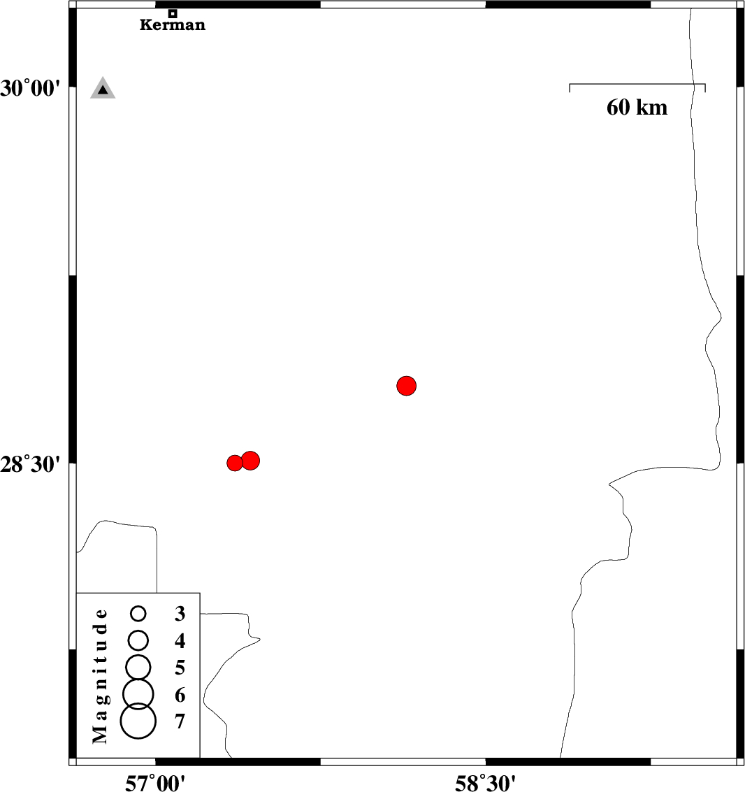 | 2019/09/23 | 12:23:17.2 | 15:53:17.2 | 28.5 | 57.36 | 14 | ML:3.3 | Kerman Province, 42 km South-West of Jiroft | ||