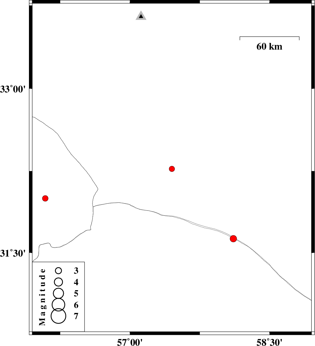 | 2019/09/29 | 12:33:15.9 | 16:03:15.9 | 32.27 | 57.45 | 14 | ML:2.7 | Yazd Province, 127 km North-East of Ravar | ||