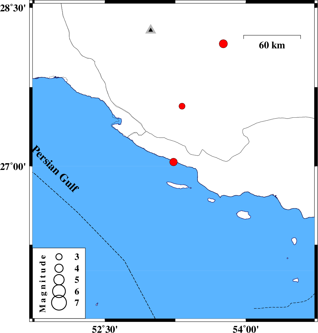 | 2019/08/12 | 23:28:26.9 | 03:58:26.9 | 27.57 | 53.32 | 14 | ML:3 | Fars Province, 30 km North-East of Lamerd | ||