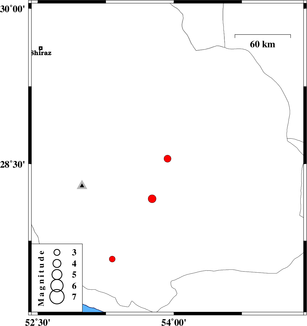 | 2019/09/06 | 14:22:50.9 | 18:52:50.9 | 28.55 | 53.93 | 11 | ML:3.5 | Fars Province, 37 km -East of Jahrom | ||