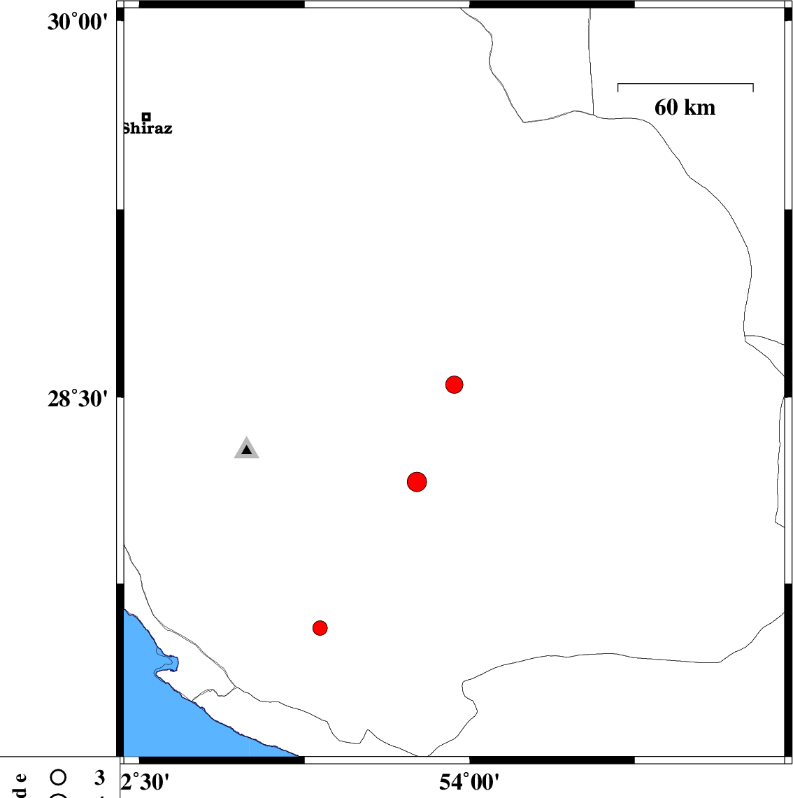 | 2019/08/12 | 23:28:26.9 | 03:58:26.9 | 27.57 | 53.32 | 14 | ML:3 | Fars Province, 30 km North-East of Lamerd | ||