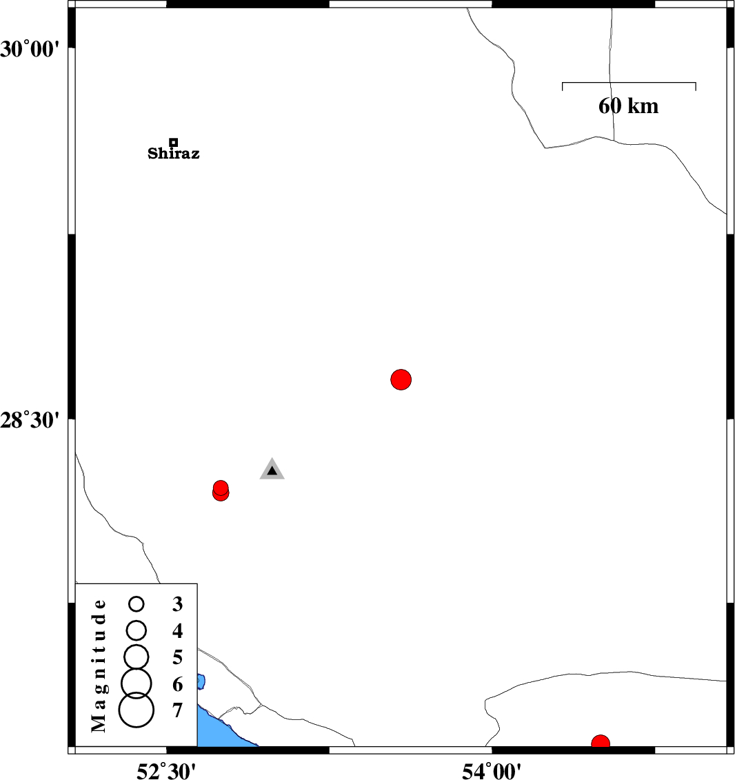 | 2019/09/26 | 12:36:14.3 | 16:06:14.3 | 28.2 | 52.75 | 11 | ML:3.4 | Fars Province, 40 km South-West of Qir va Karzin | ||