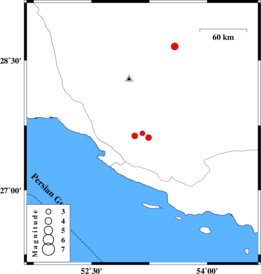 | 2019/10/04 | 08:43:09.7 | 12:13:09.7 | 27.61 | 53.24 | 14 | ML:3.5 | Fars Province, 32 km North of Lamerd | ||