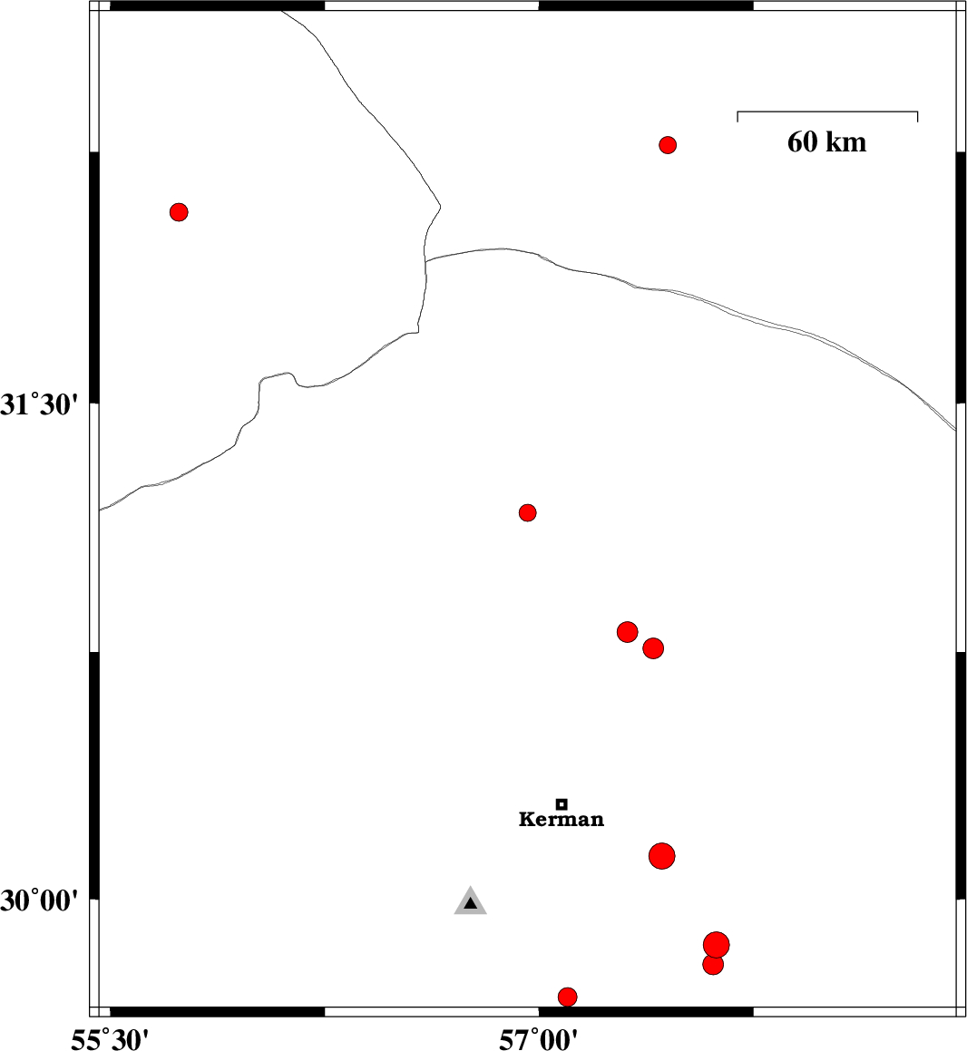 | 2019/09/19 | 07:24:15.4 | 11:54:15.4 | 29.86 | 57.62 | 10 | ML:4.1 | Kerman Province, 71 km South-East of Kerman | ||