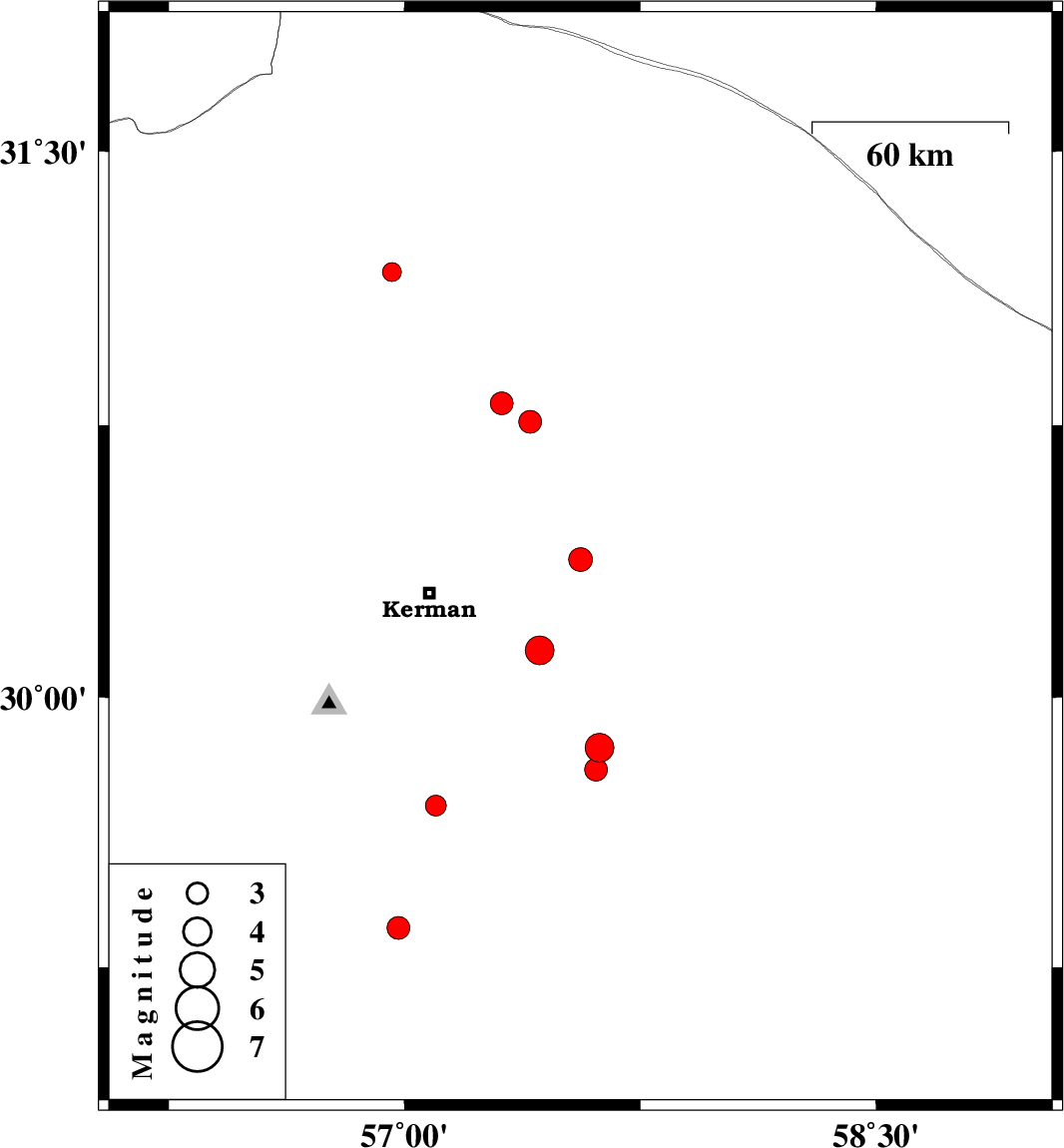 | 2019/09/13 | 03:33:00.7 | 08:03:00.7 | 30.76 | 57.4 | 14 | ML:3.2 | Kerman Province, 61 km North-East of Kerman | ||