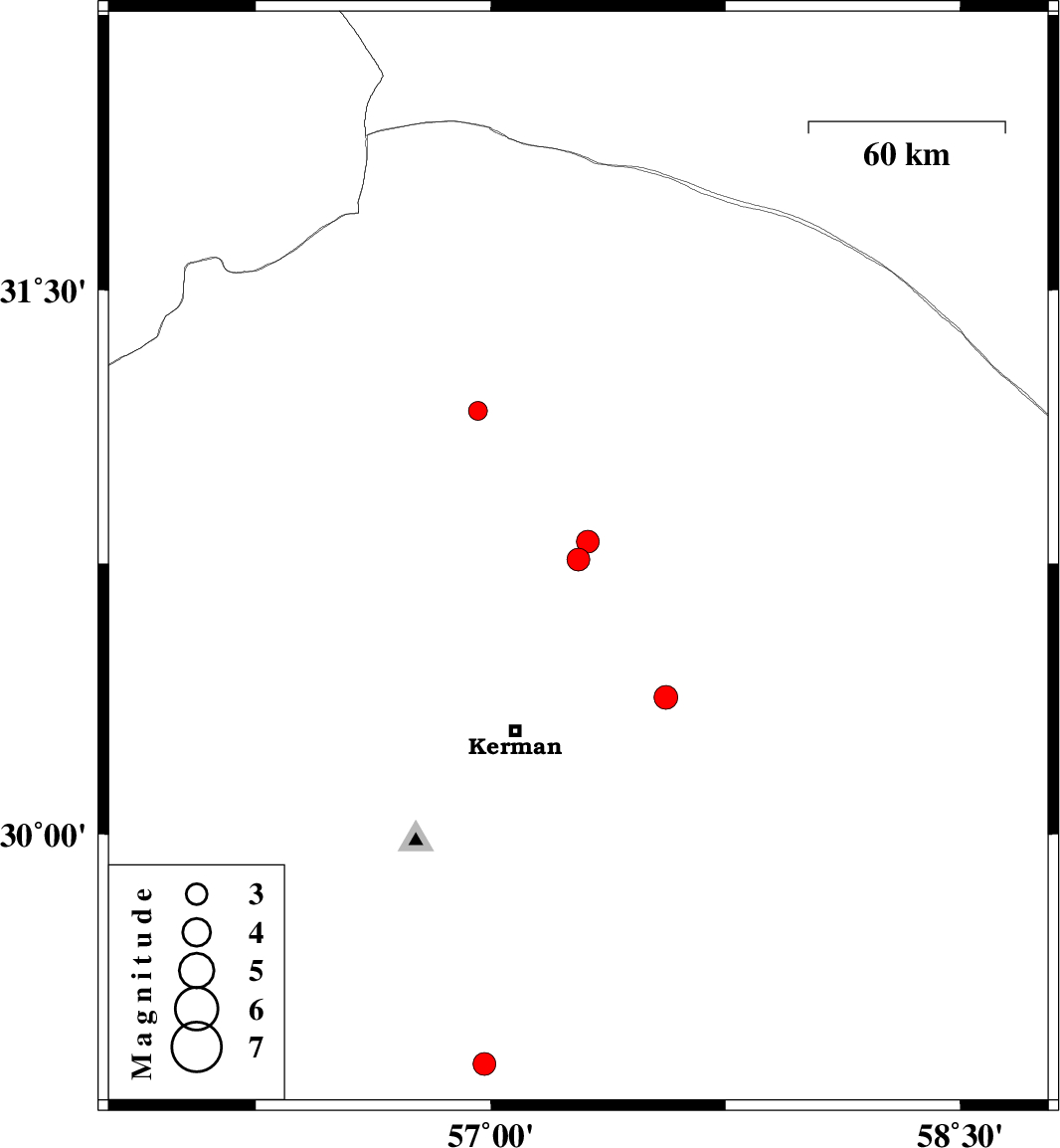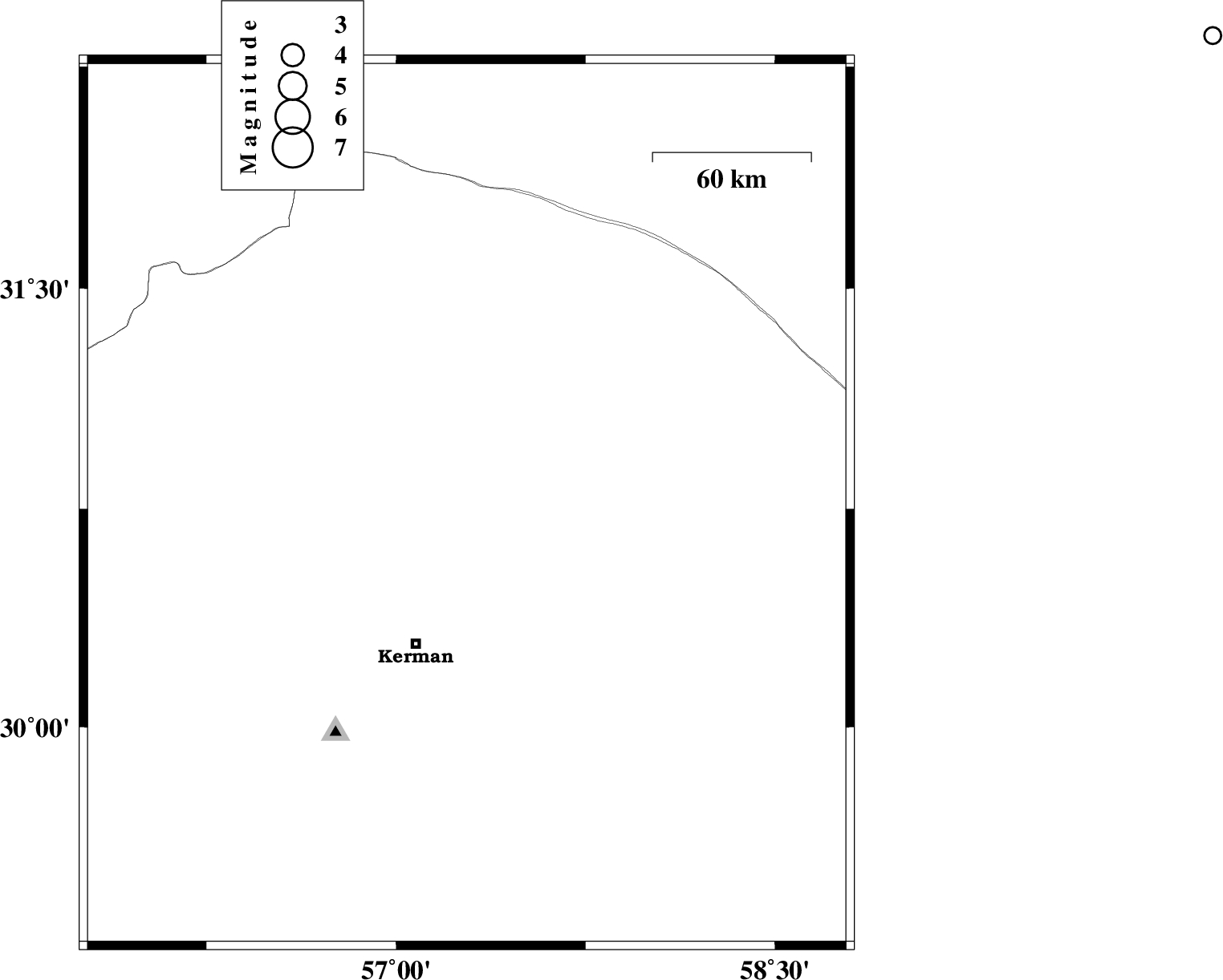 | 2019/10/09 | 15:34:21.1 | 19:04:21.1 | 30.76 | 57.28 | 14 | ML:3.3 | Kerman Province, 56 km North-East of Kerman | ||