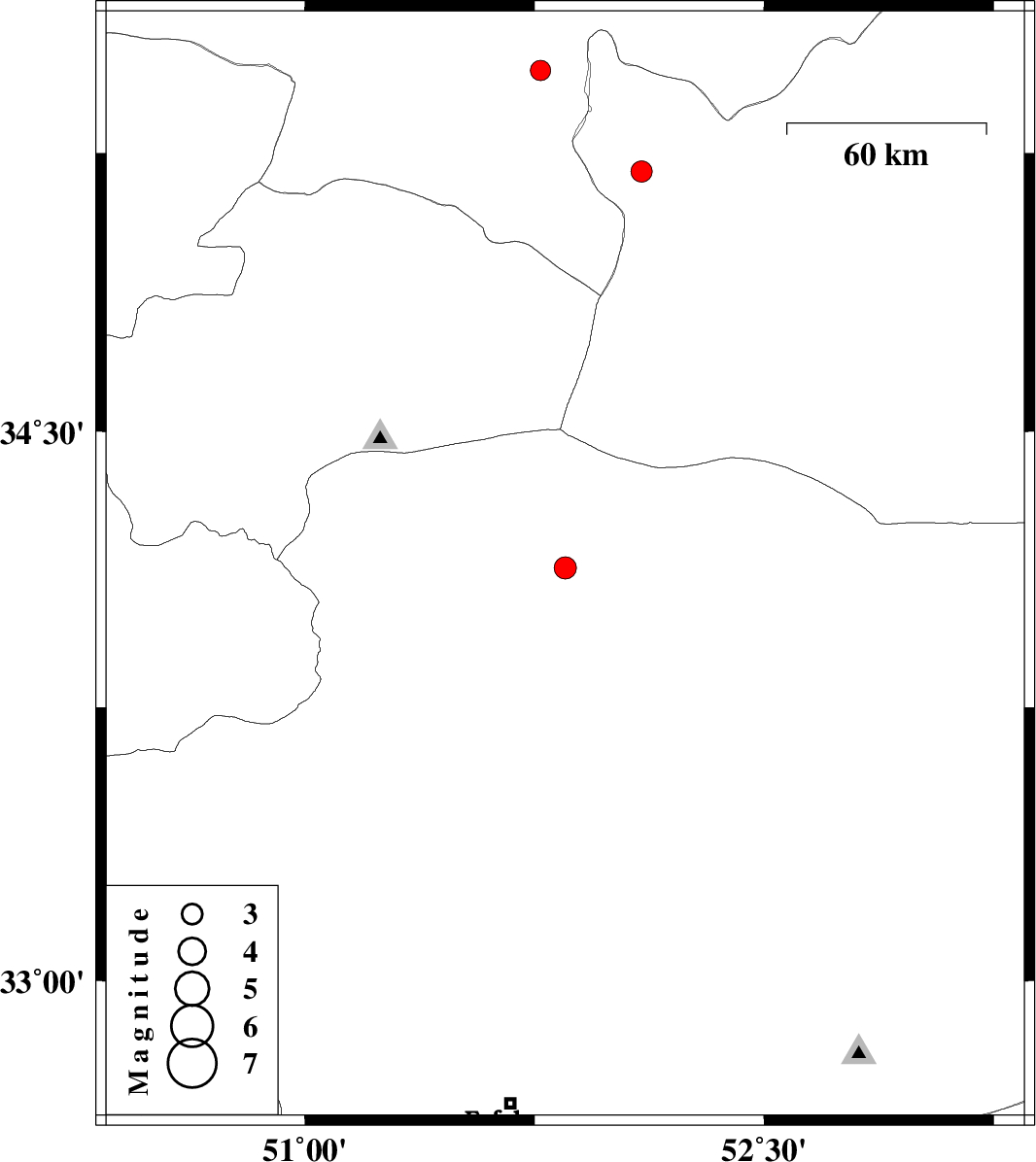 | 2019/09/26 | 09:23:16.8 | 12:53:16.8 | 35.2 | 52.1 | 14 | ML:3.1 | Semnan Province, 22 km -West of Garmsar |