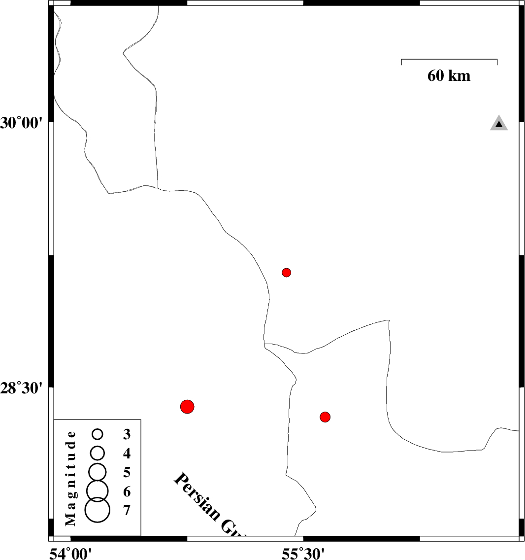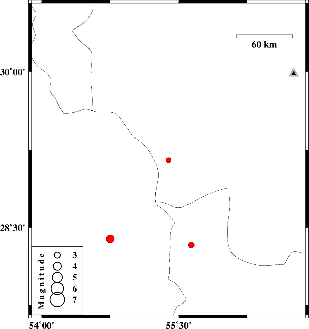 | 2019/10/11 | 09:19:34.8 | 12:49:34.8 | 28.39 | 54.75 | 10 | ML:4 | Fars Province, 45 km South-East of Darab | ||