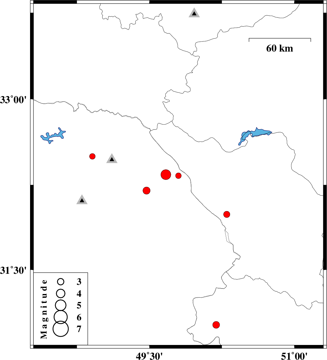 | 2019/10/13 | 05:58:50.8 | 09:28:50.8 | 32.33 | 49.8 | 14 | ML:2.7 | Khoozestan Province, 34 km South-West of Chelgard | ||