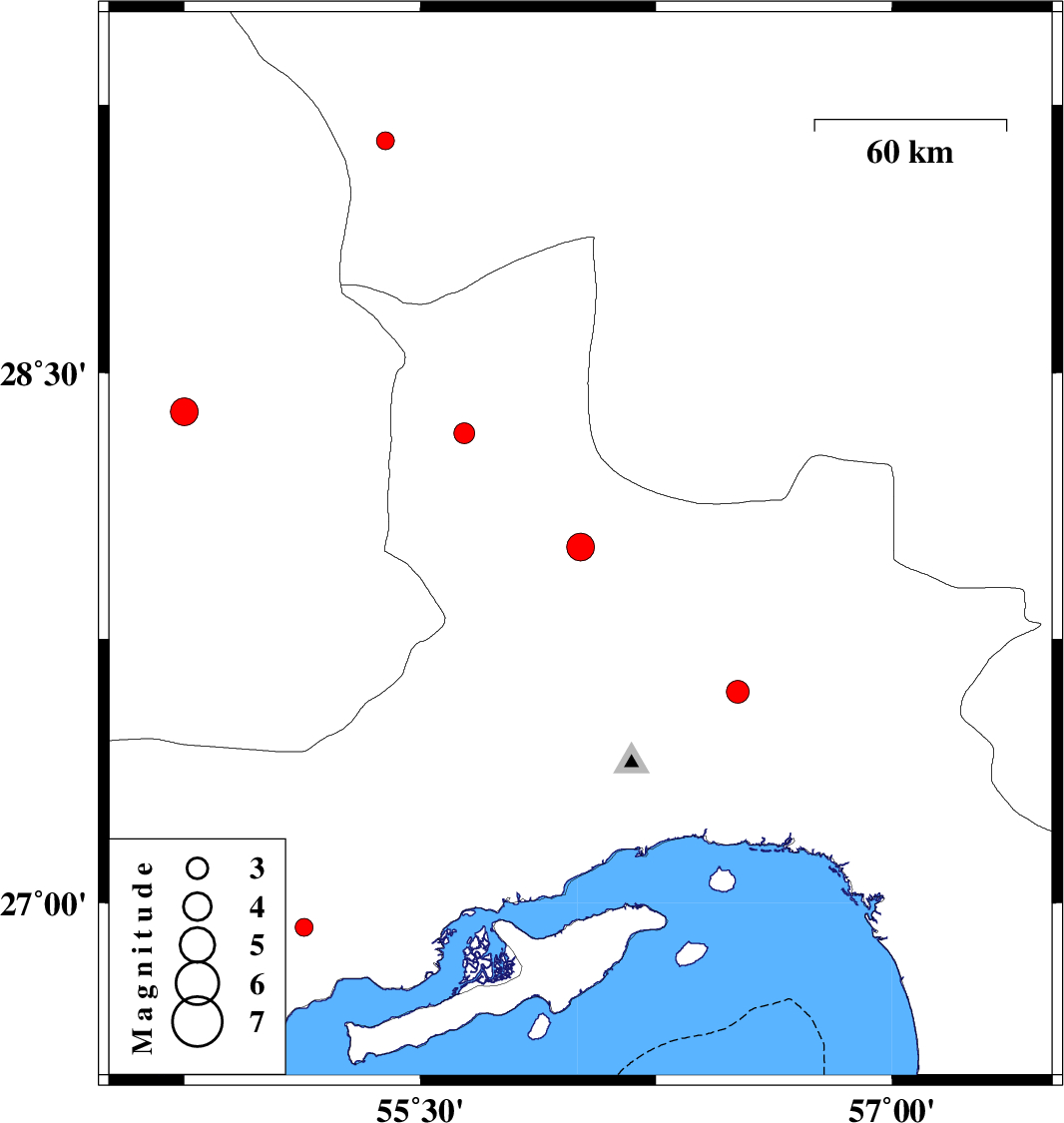 | 2019/10/12 | 16:49:40.3 | 20:19:40.3 | 26.93 | 55.13 | 15 | ML:2.6 | Hormozgan Province, 53 km North-East of Bandar-e lengeh | ||