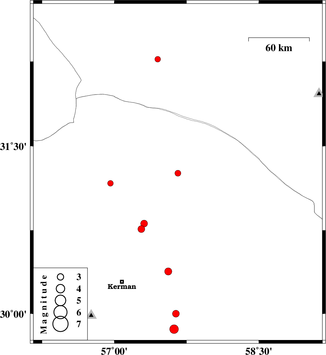 | 2019/09/19 | 07:24:15.4 | 11:54:15.4 | 29.86 | 57.62 | 10 | ML:4.1 | Kerman Province, 71 km South-East of Kerman |
