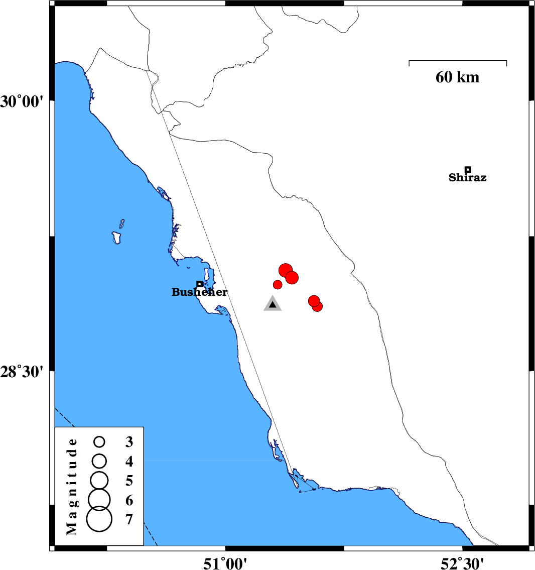| 2019/10/12 | 20:53:26.1 | 00:23:26.1 | 28.98 | 51.33 | 5 | ML:2.6 | Bushehr Province, 13 km North of Ahram |