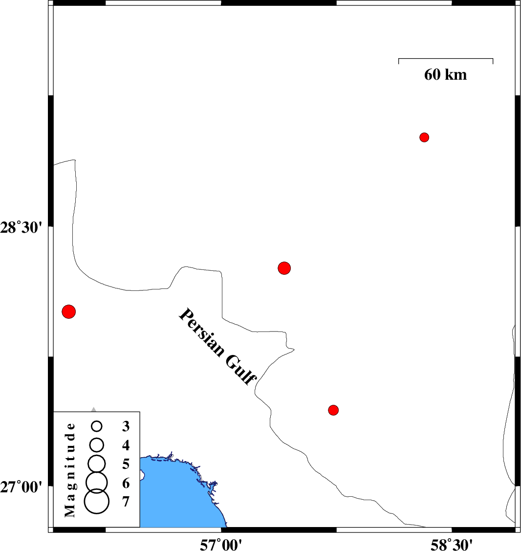 | 2019/10/19 | 04:56:56.6 | 08:26:56.6 | 28.26 | 57.41 | 14 | ML:3.6 | Kerman Province, 44 km North-West of Kahnuj | ||