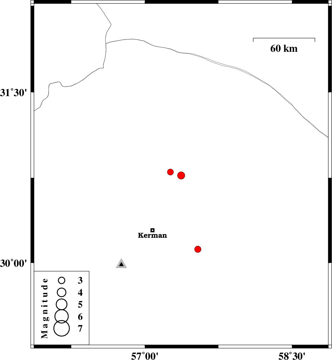| 2019/10/15 | 01:20:17.8 | 04:50:17.8 | 30.12 | 57.54 | 14 | ML:2.9 | Kerman Province, 48 km South-East of Kerman |