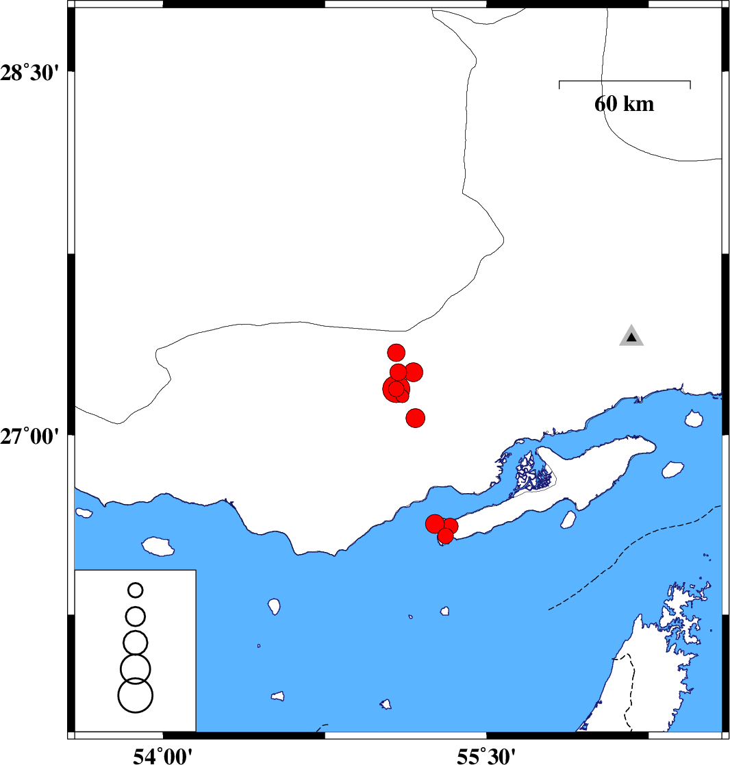 2019/10/18 04:09:38.8 07:39:38.8 26.6355.2614 ML:4 Persian Gulf, 42 km North-East of Bandar-e lengeh