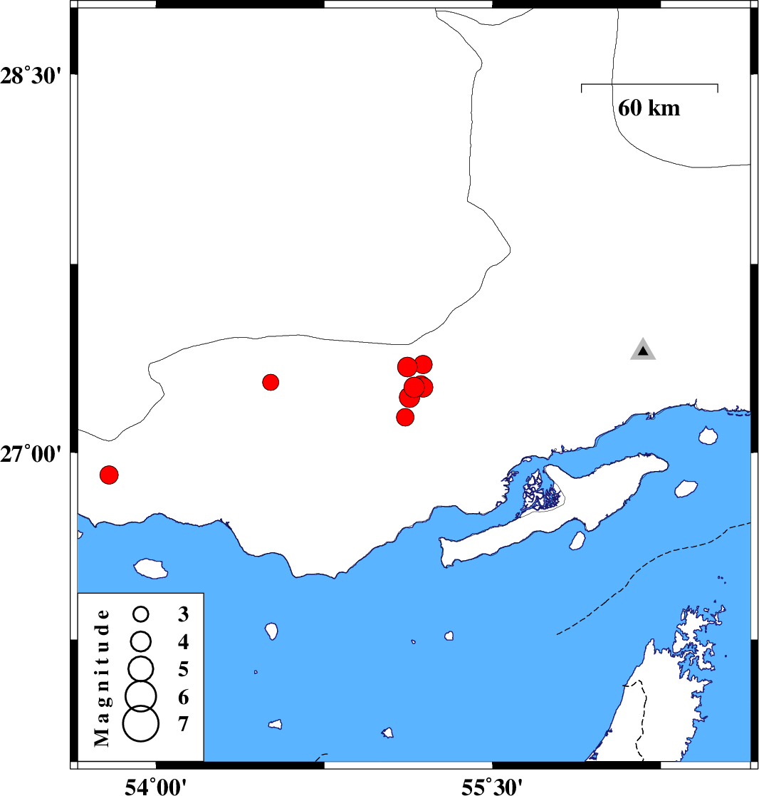 | 2019/10/30 | 11:33:06.9 | 15:03:06.9 | 27.34 | 55.12 | 14 | ML:4 | Hormozgan Province, 76 km North-East of Bastak | ||