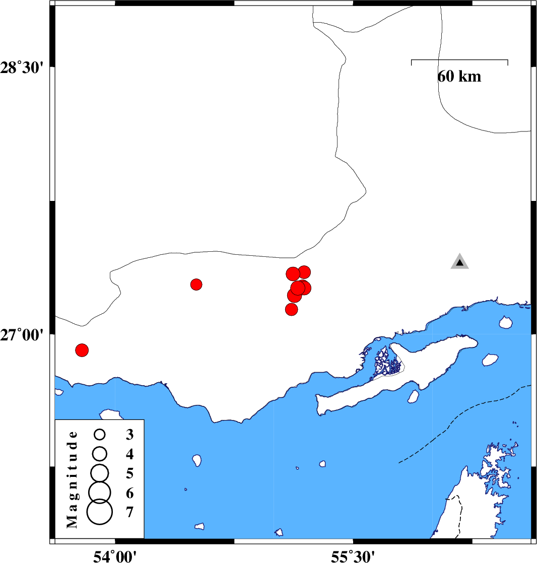 | 2019/10/30 | 11:33:06.9 | 15:03:06.9 | 27.34 | 55.12 | 14 | ML:4 | Hormozgan Province, 76 km North-East of Bastak | ||