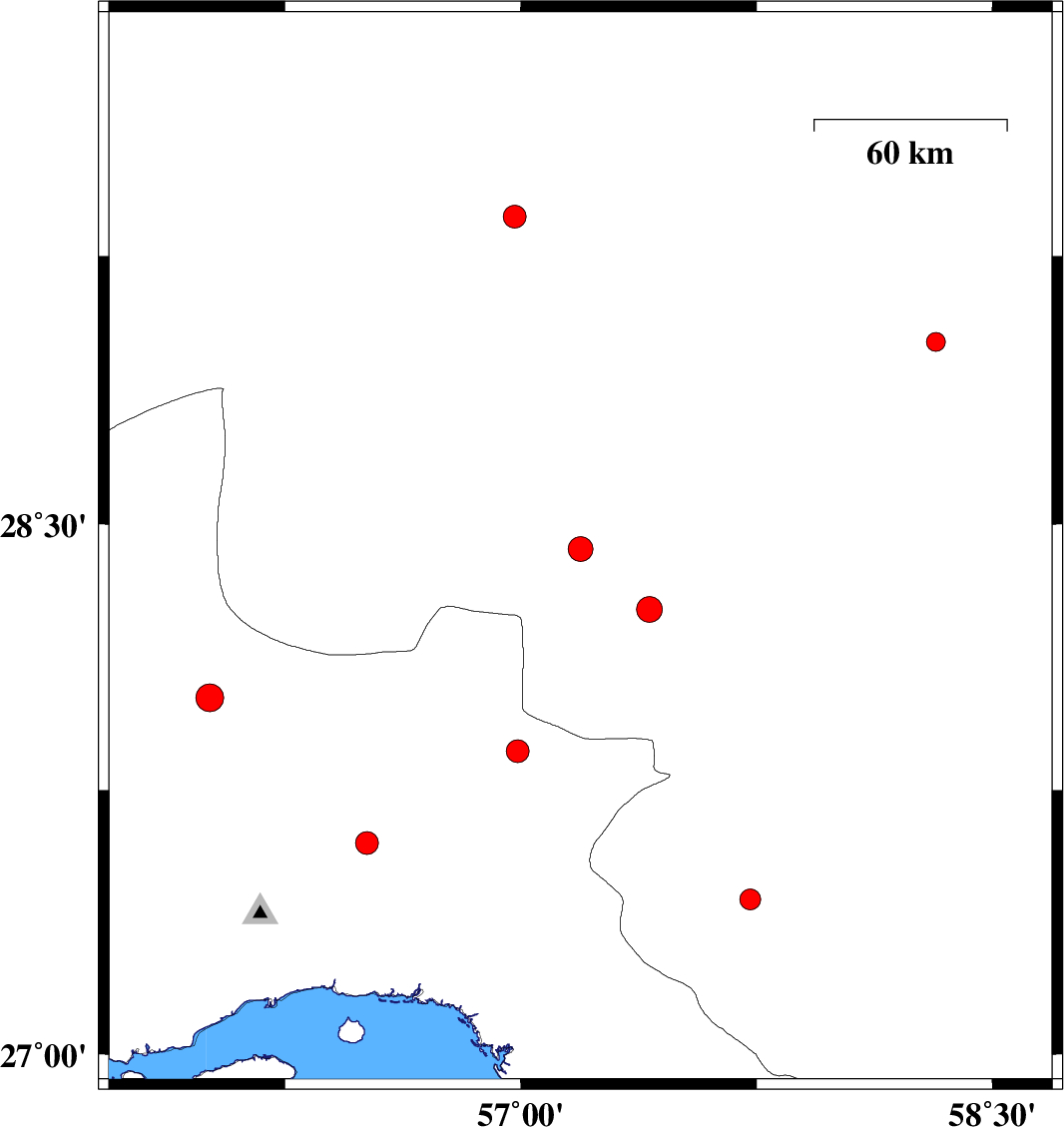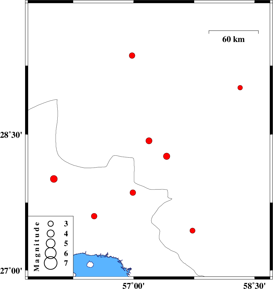 | 2019/10/19 | 04:56:56.6 | 08:26:56.6 | 28.26 | 57.41 | 14 | ML:3.6 | Kerman Province, 44 km North-West of Kahnuj | ||