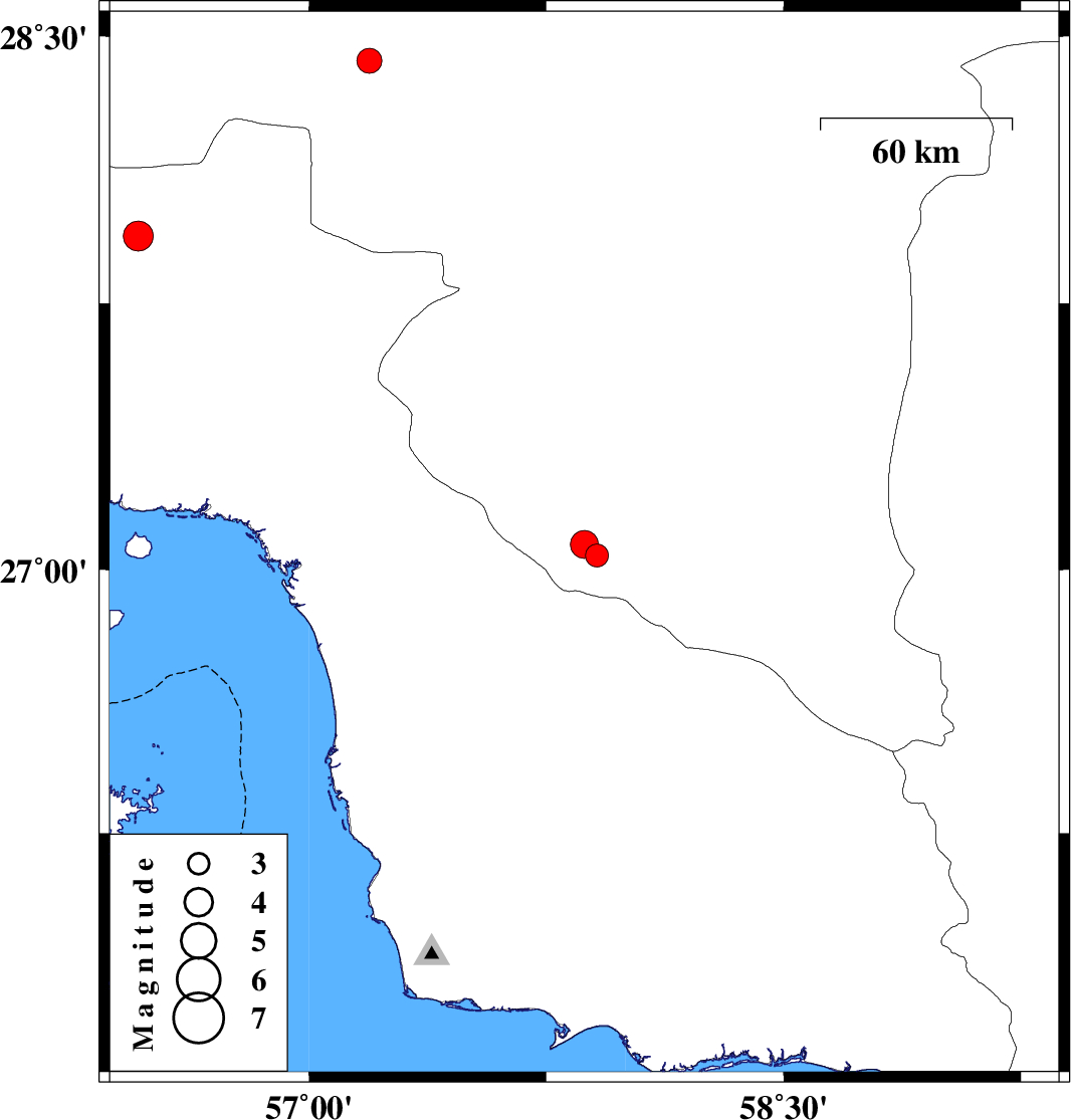 | 2019/11/11 | 00:12:29.8 | 03:42:29.8 | 27.07 | 57.87 | 14 | ML:4 | Kerman Province, 53 km South-East of Manujan | ||