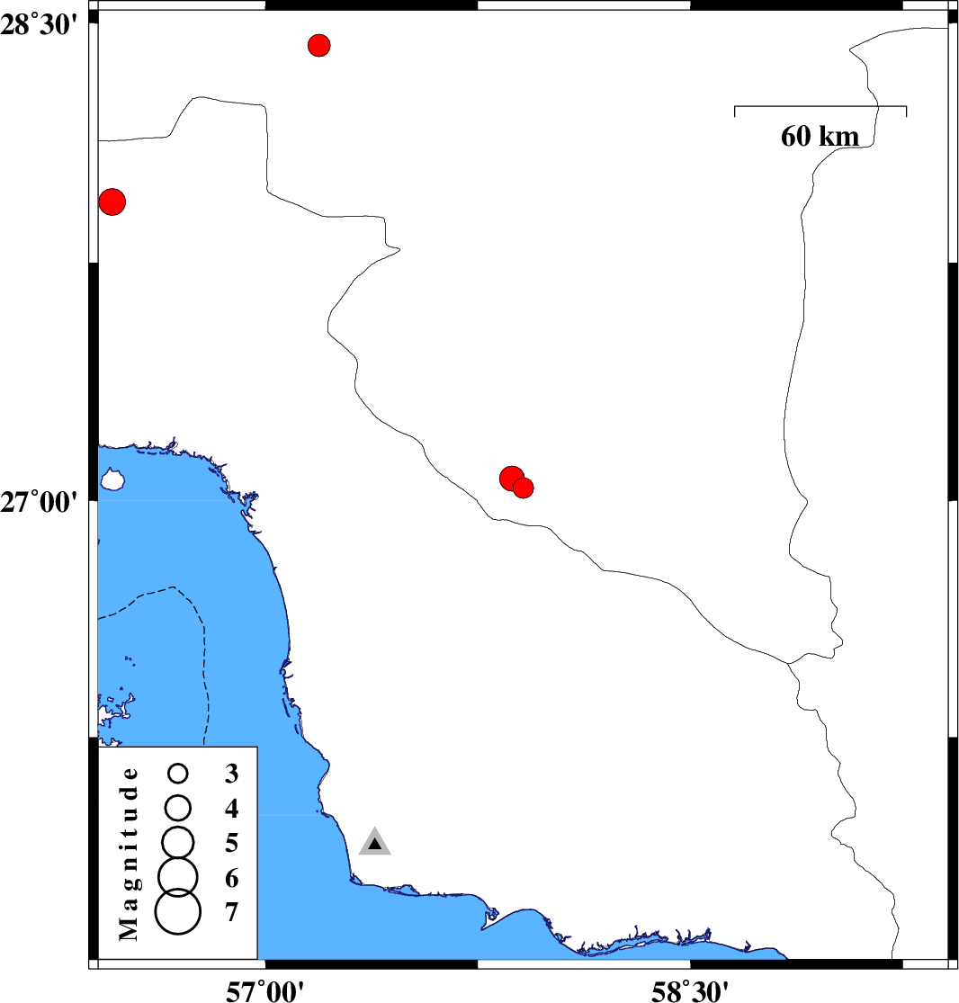 | 2019/11/11 | 00:12:29.8 | 03:42:29.8 | 27.07 | 57.87 | 14 | ML:4 | Kerman Province, 53 km South-East of Manujan | ||