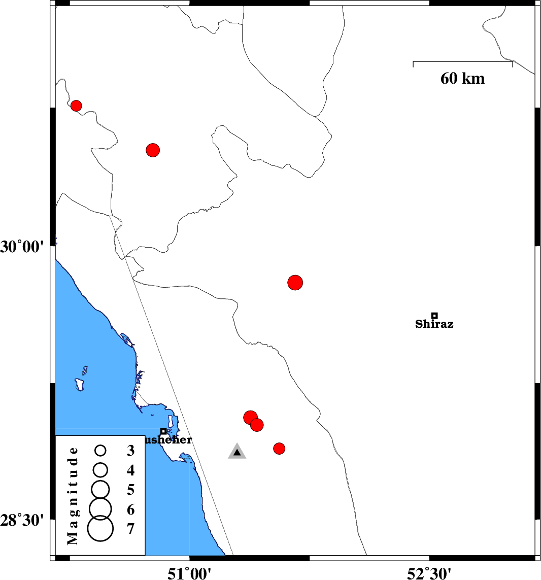 | 2019/10/18 | 03:00:12.0 | 06:30:12.0 | 29.06 | 51.38 | 10 | ML:4 | Bushehr Province, 23 km North-East of Ahram | ||
