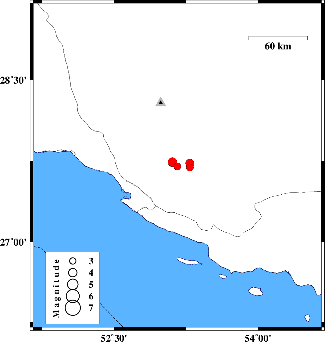 | 2019/11/13 | 19:46:31.3 | 23:16:31.3 | 27.67 | 53.03 | 10 | ML:3.4 | Fars Province, 20 km North-East of Mehr | ||
