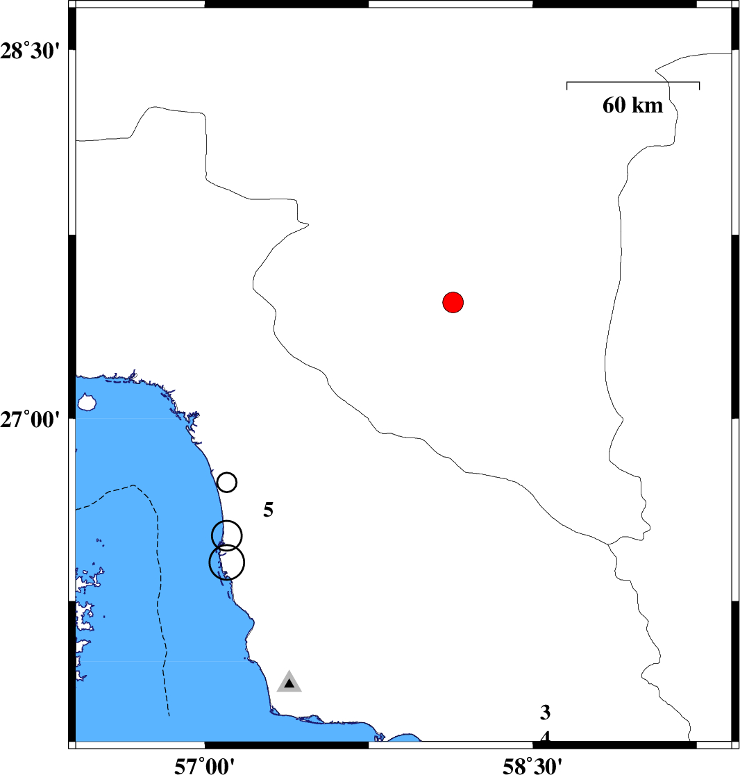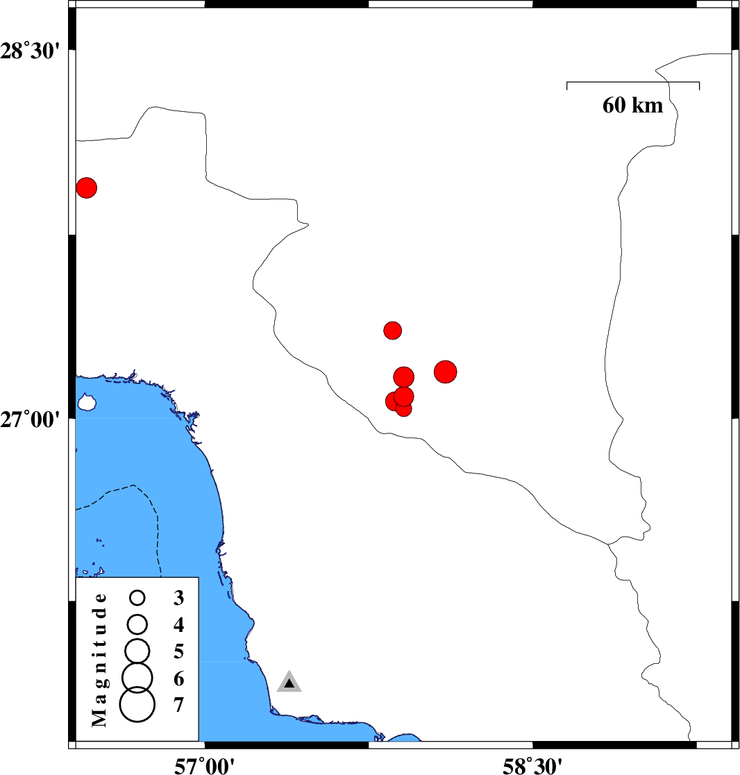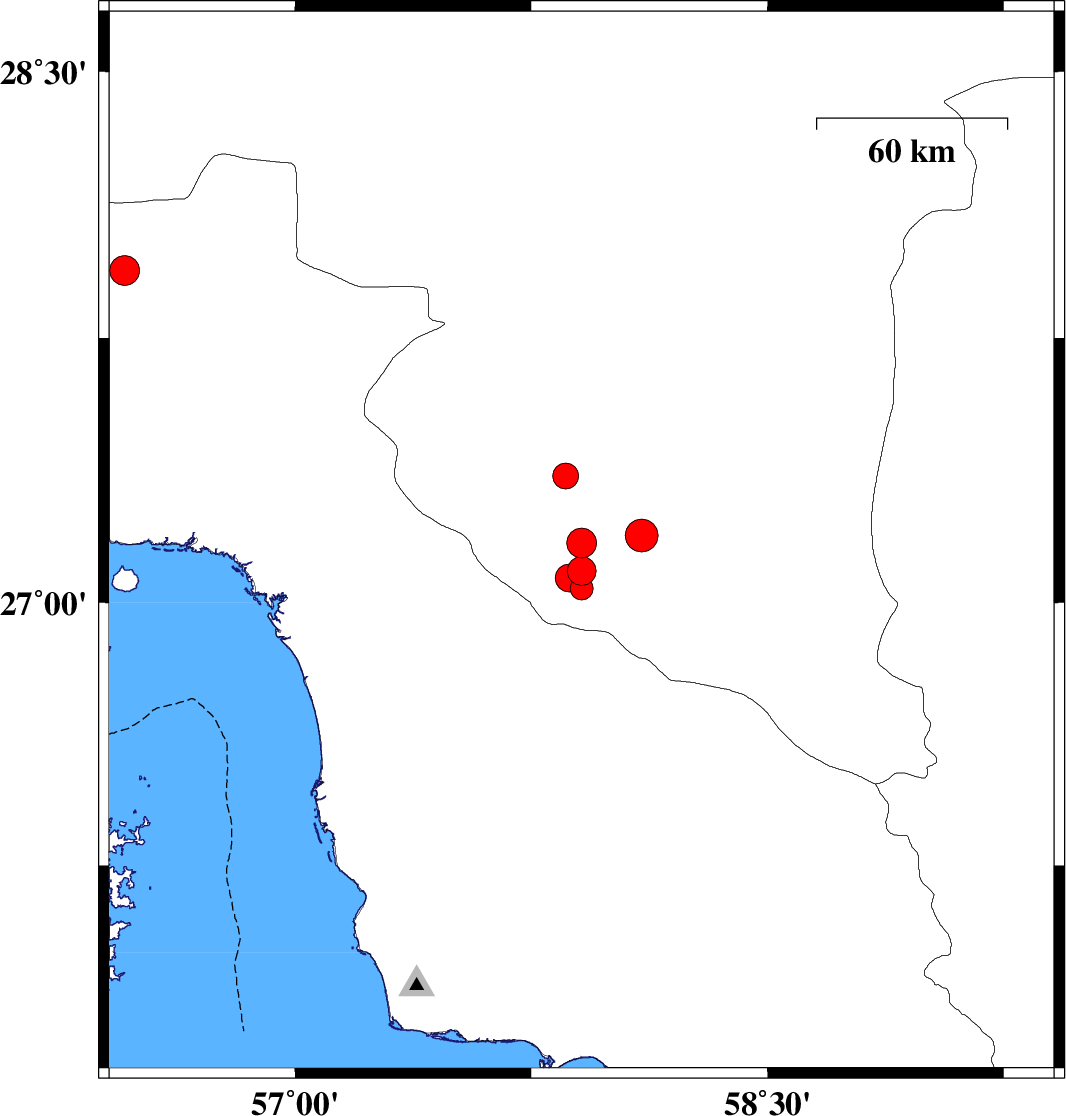 | 2019/11/11 | 00:12:29.8 | 03:42:29.8 | 27.07 | 57.87 | 14 | ML:4 | Kerman Province, 53 km South-East of Manujan | ||