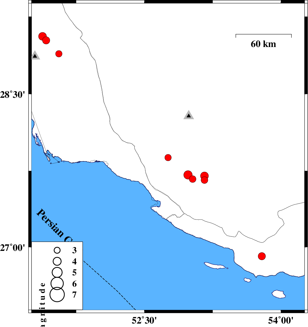 | 2019/11/14 | 00:23:28.2 | 03:53:28.2 | 27.88 | 52.76 | 10 | ML:3.2 | Fars Province, 39 km North-West of Mehr | ||