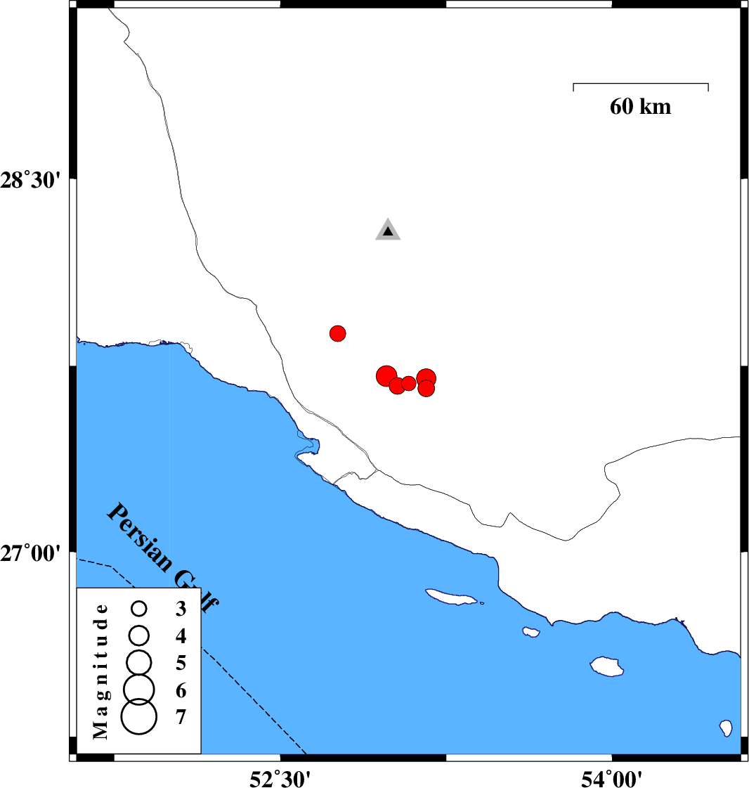 | 2019/11/14 | 00:23:28.2 | 03:53:28.2 | 27.88 | 52.76 | 10 | ML:3.2 | Fars Province, 39 km North-West of Mehr | ||