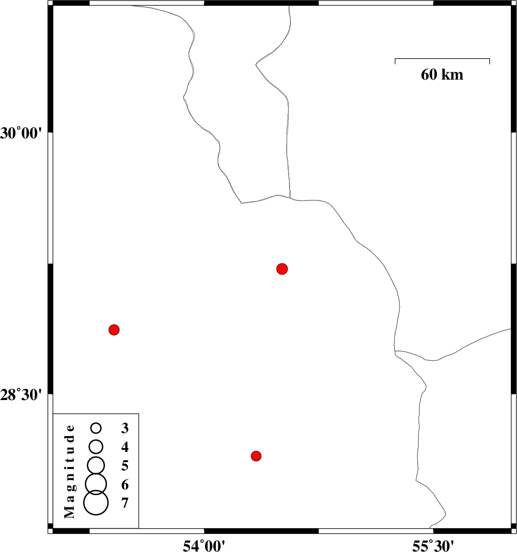| 2019/11/05 | 01:17:55.8 | 04:47:55.8 | 28.14 | 54.34 | 14 | ML:2.9 | Fars Province, 51 km North of Lar |