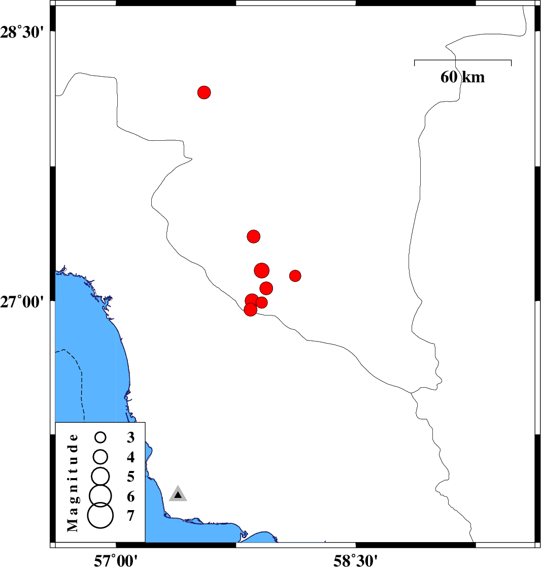 | 2019/11/19 | 18:49:49.2 | 22:19:49.2 | 27.07 | 57.94 | 14 | ML:3.7 | Kerman Province, 58 km South-East of Manujan | ||